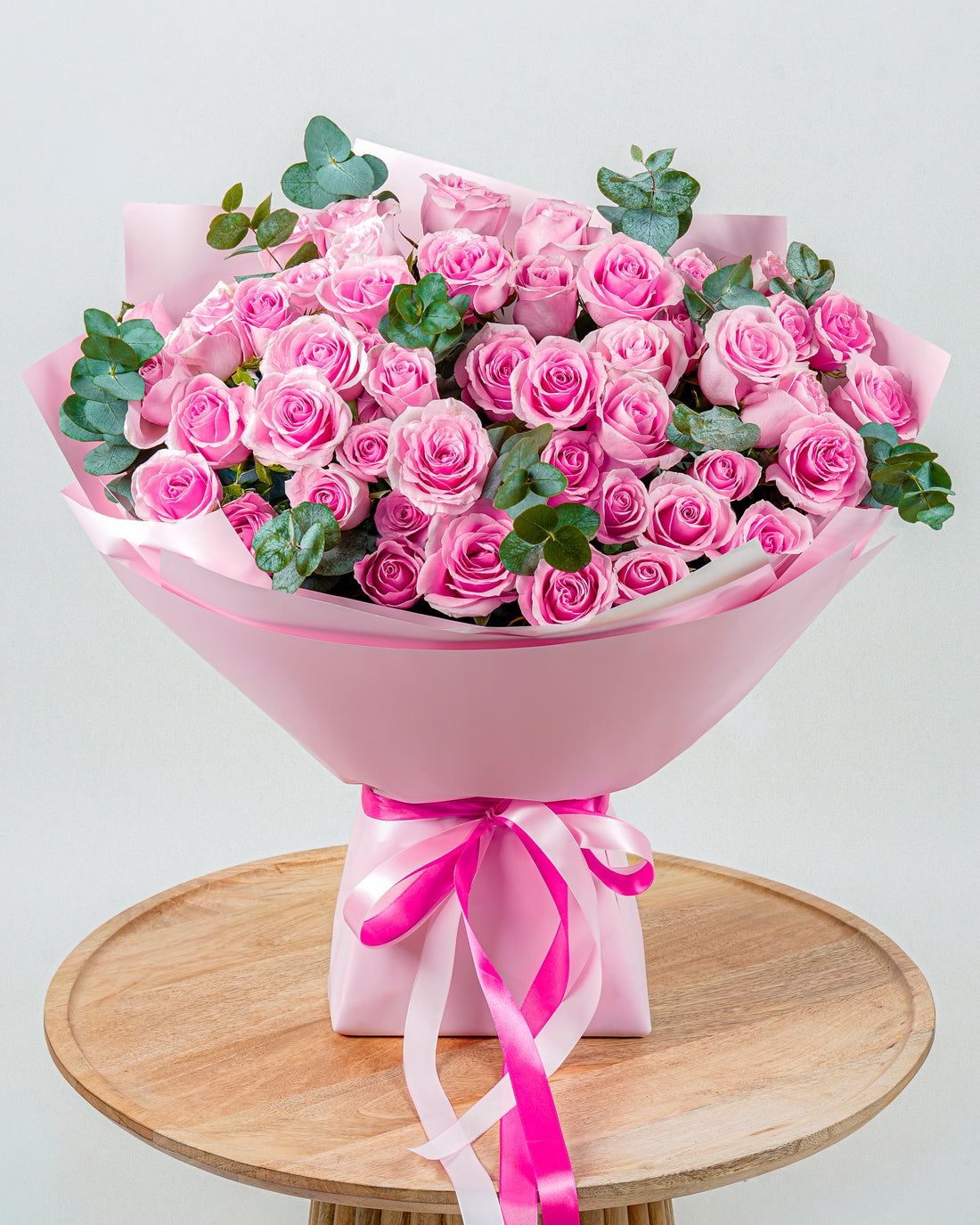 احتفلي بالأناقة والرقي مع صندوق زهورنا الفاخر من "الورود الوردية". باقة رومانسية وراقية مصممة لترك...