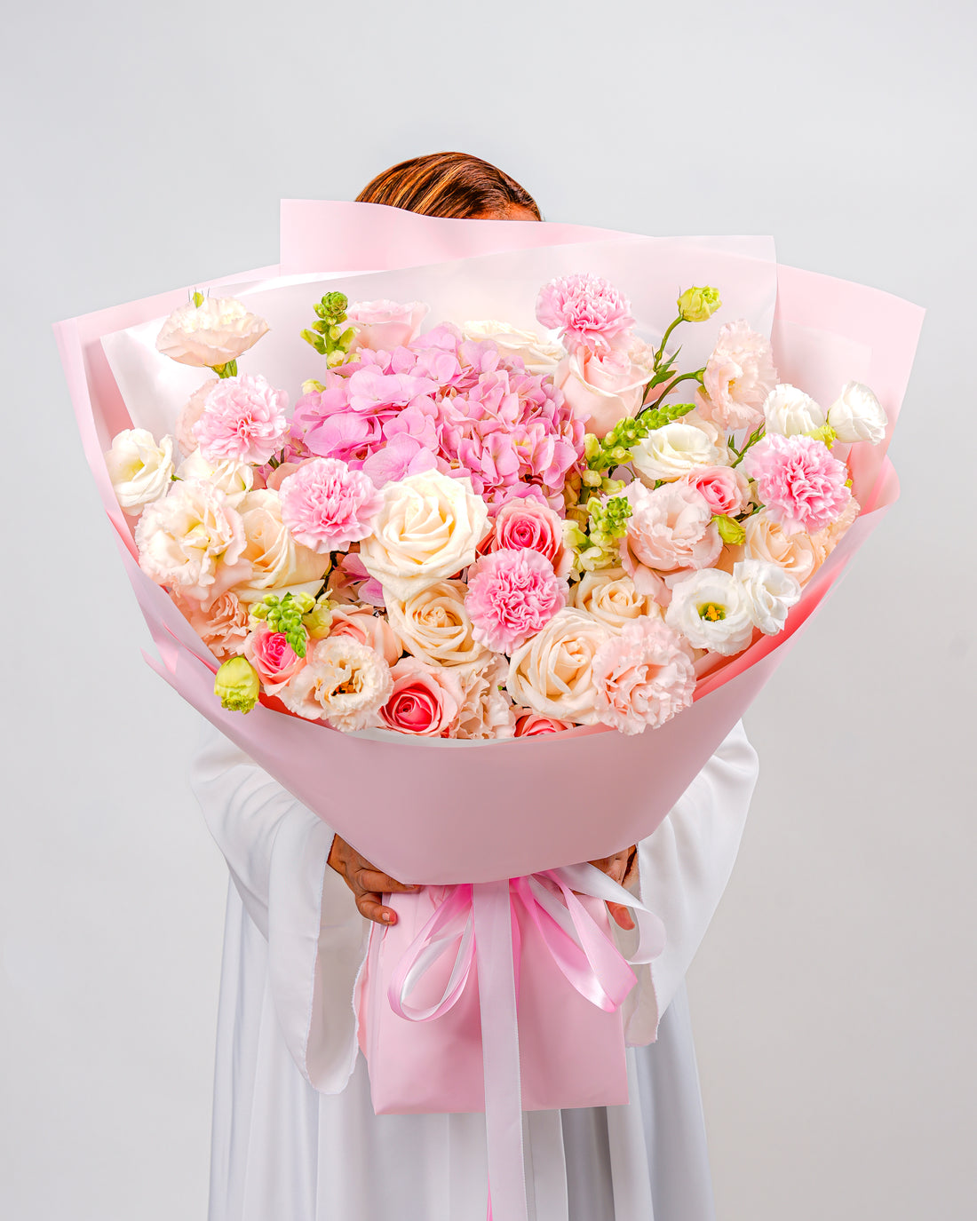 The Blush Muse Bouquet is a stunning composition of soft Hydrangeas, Roses, Carnations, Lisianthus, and Snapdragons,...