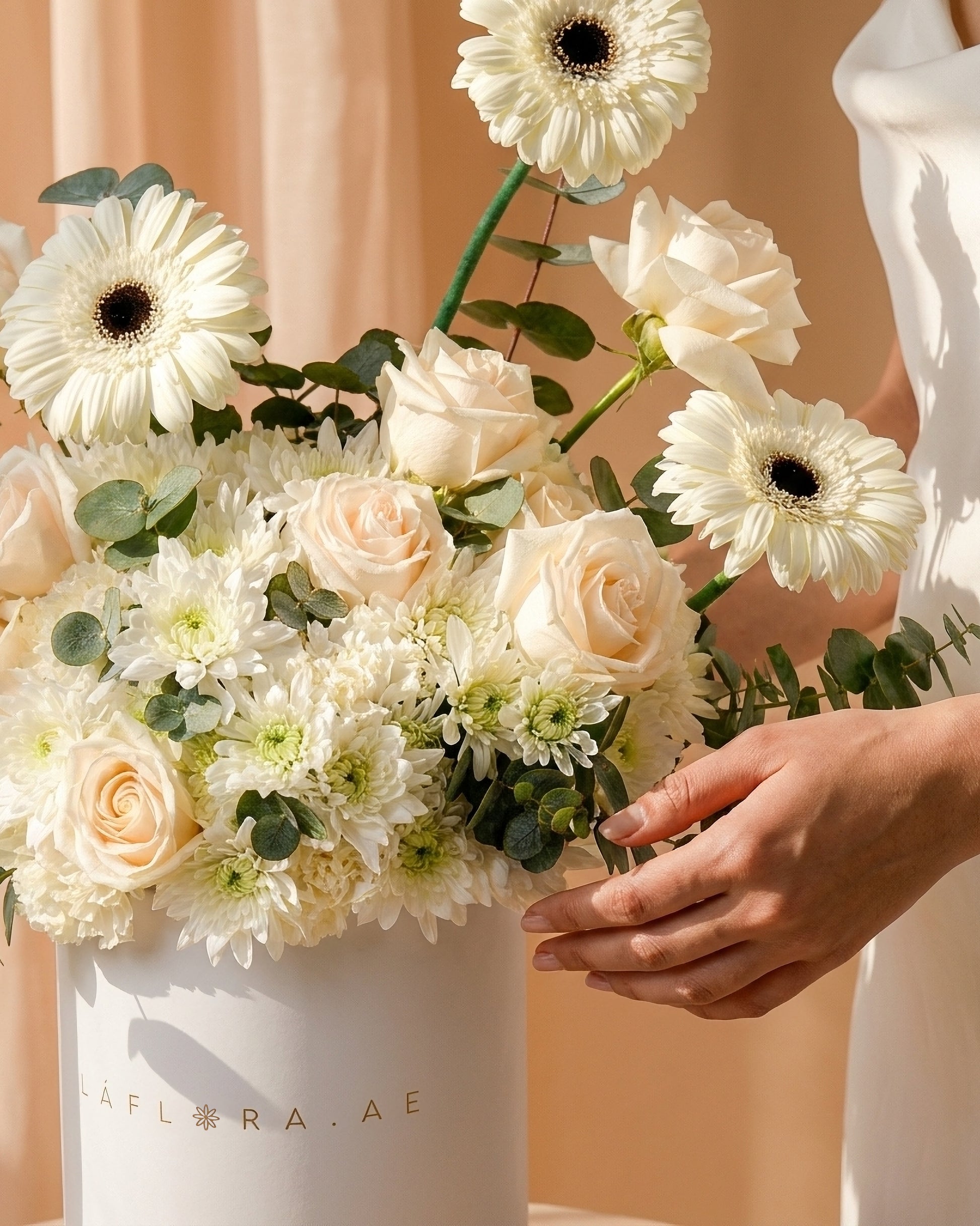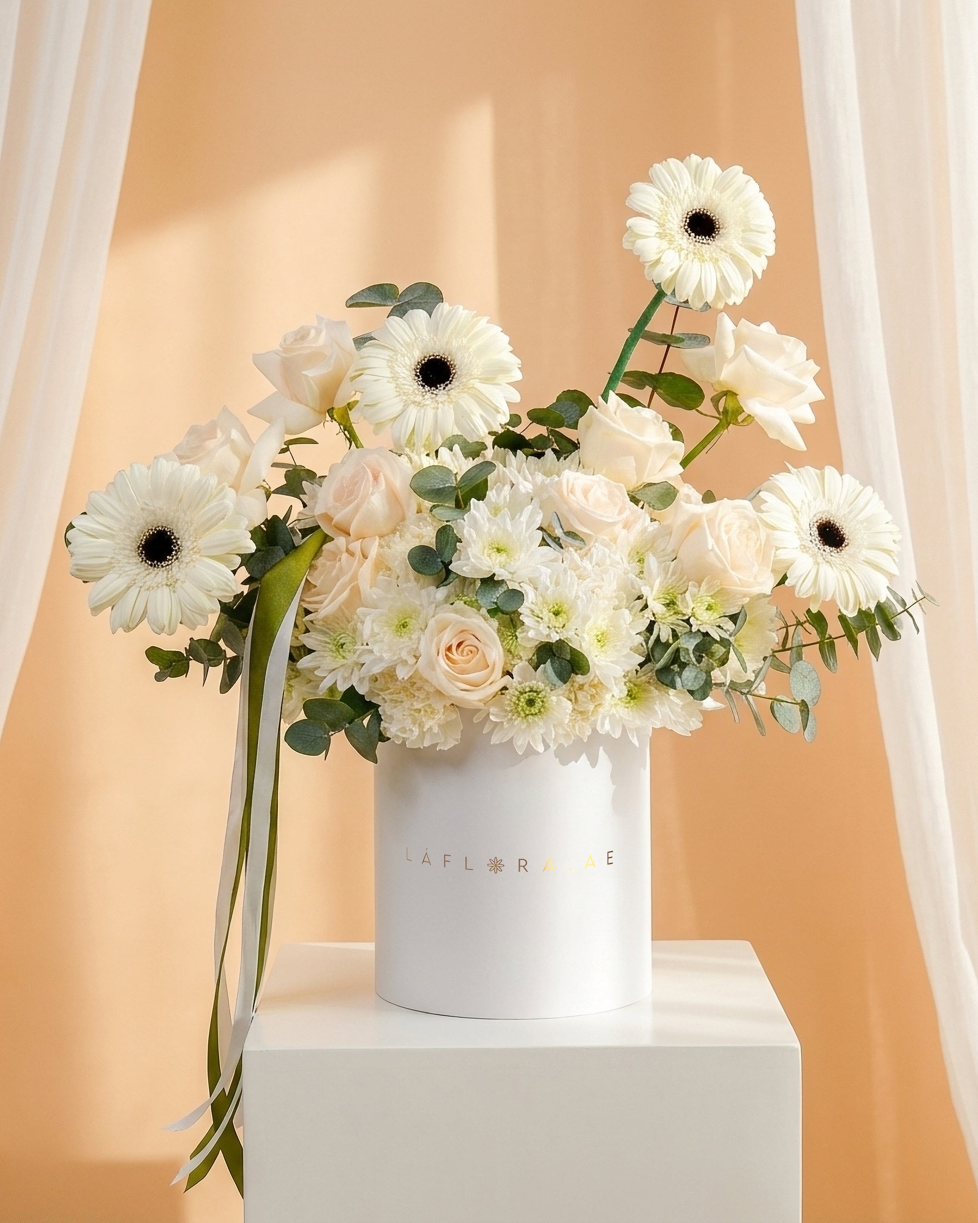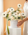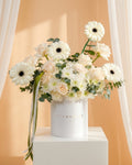 صندوق السكينة الألبية إبداعٌ خالدٌ مستوحى من سحر المناظر الطبيعية الثلجية الهادئة. يتميز هذا الباقة بورود بيضاء نقية، وأزهار جربيرا أنيقة، وأزهار موسمية، وأوكالبتوس، مما يجعله مثاليًا للاحتفال بسحر الشتاء أو إضفاء لمسة من الأناقة على أي مناسبة. مزيج القوام والألوان الهادئة يخلق تصميمًا متناغمًا ينضح بالرقي والأناقة.