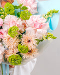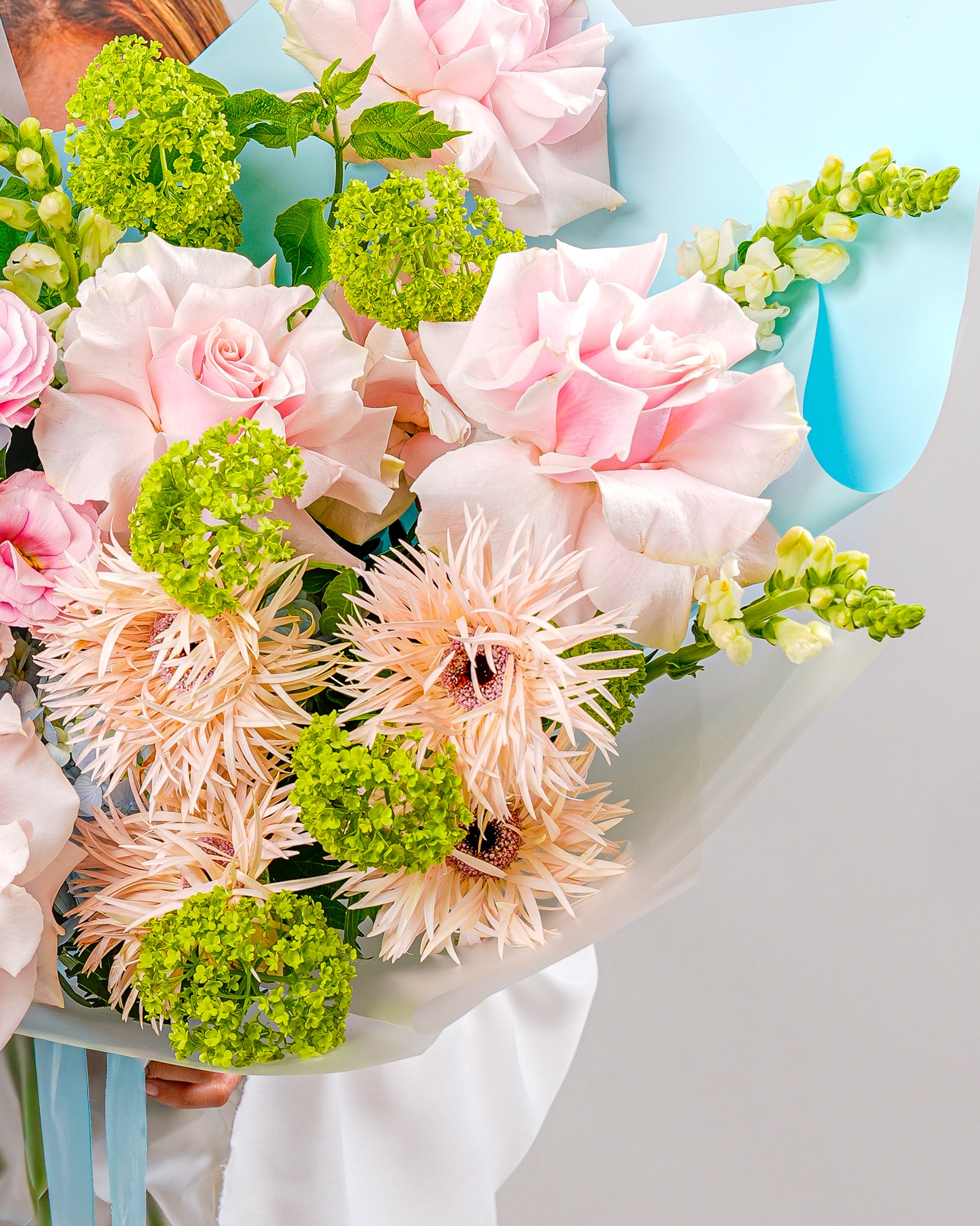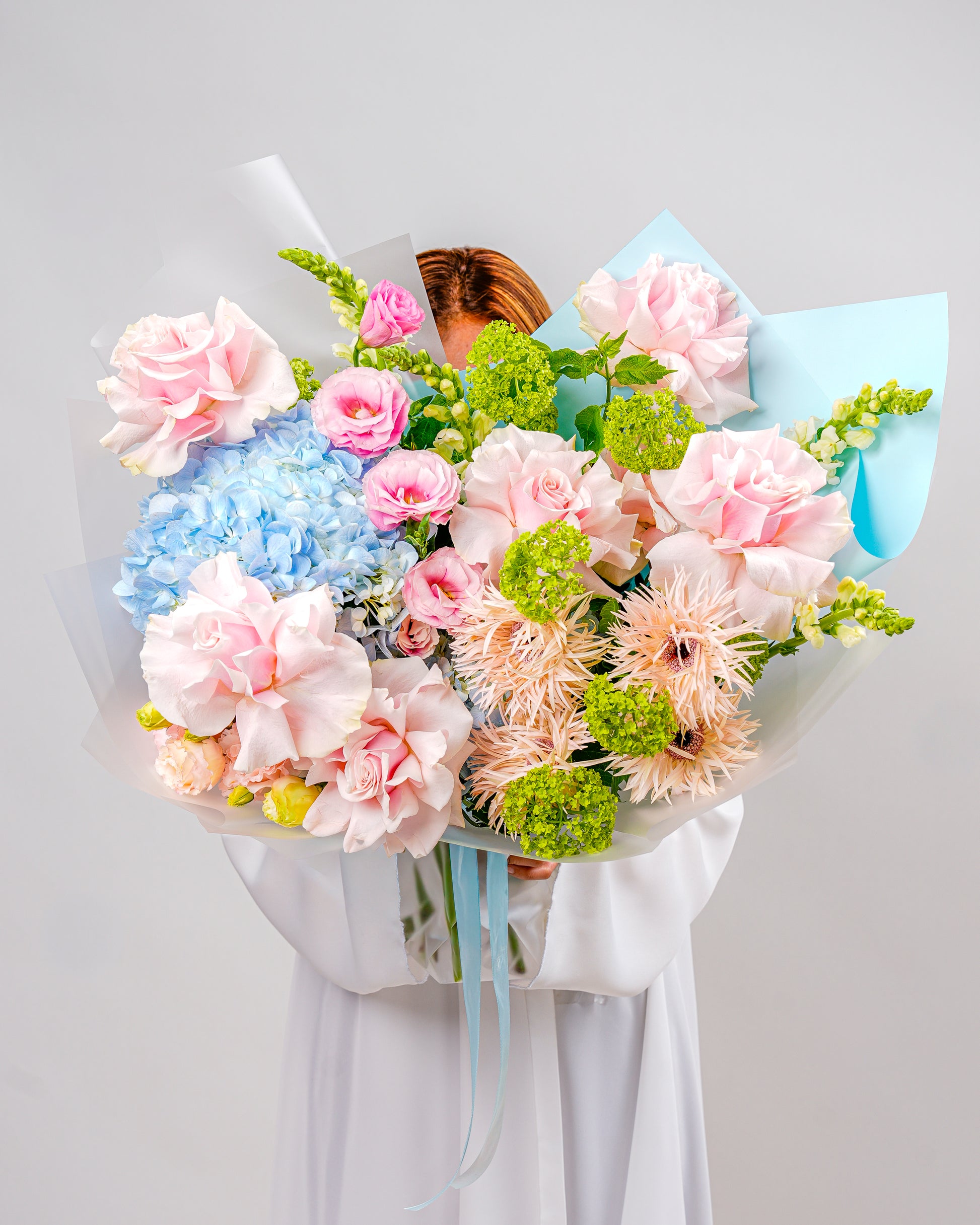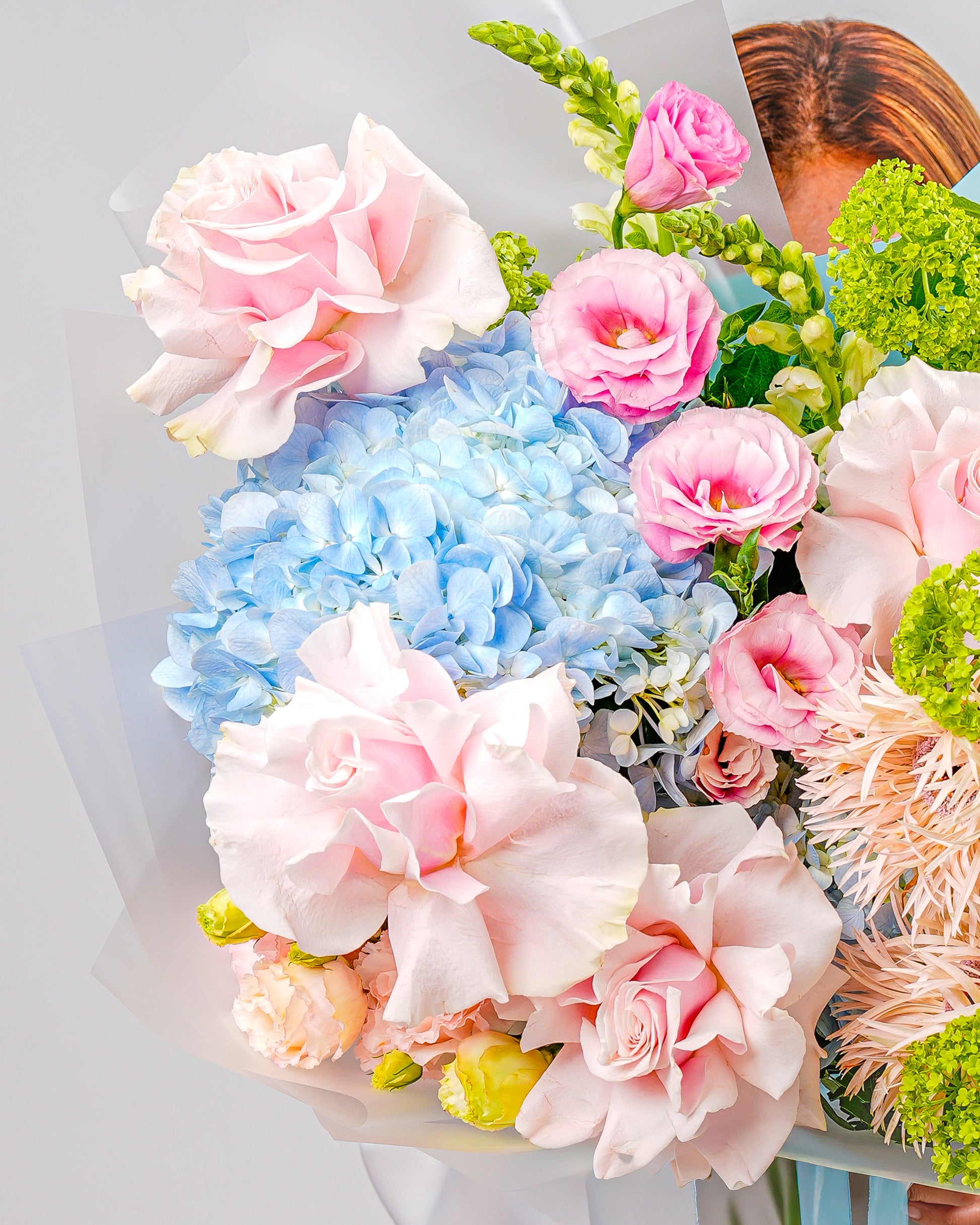 The Fable Blooms Bouquet is a captivating arrangement of pastel-hued blooms, artfully combining Rose Mondial, Spider Gerberas, Light Pink Lisianthus, Soft Blue Hydrangeas, Snapdragons, and Viburnum. Each flower is carefully selected for premium freshness and quality, creating a layered, harmonious composition that radiates soft elegance and whimsical charm.