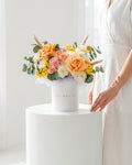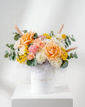 يجسد هذا الترتيب الزهري الرائع الأناقة والدفء، ويتميز بالجمال الخالد للون الأبيض أقحوان وورود الخوخ. إضافة الجبسوفيلا الصفراء والقرنفل الوردي الناعم وورود الخوخ المرذاذة تُضفي لمسةً من الحيوية والسحر على التصميم.