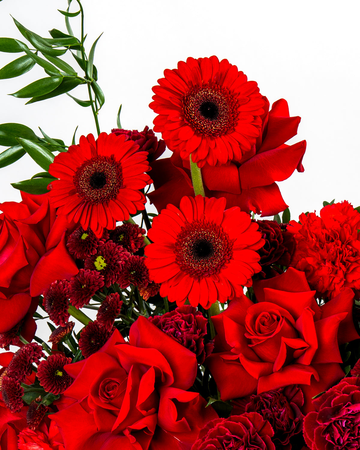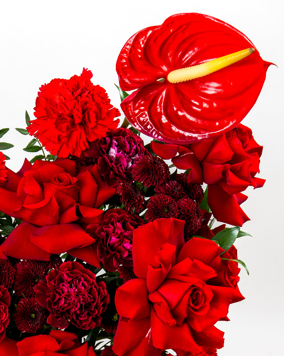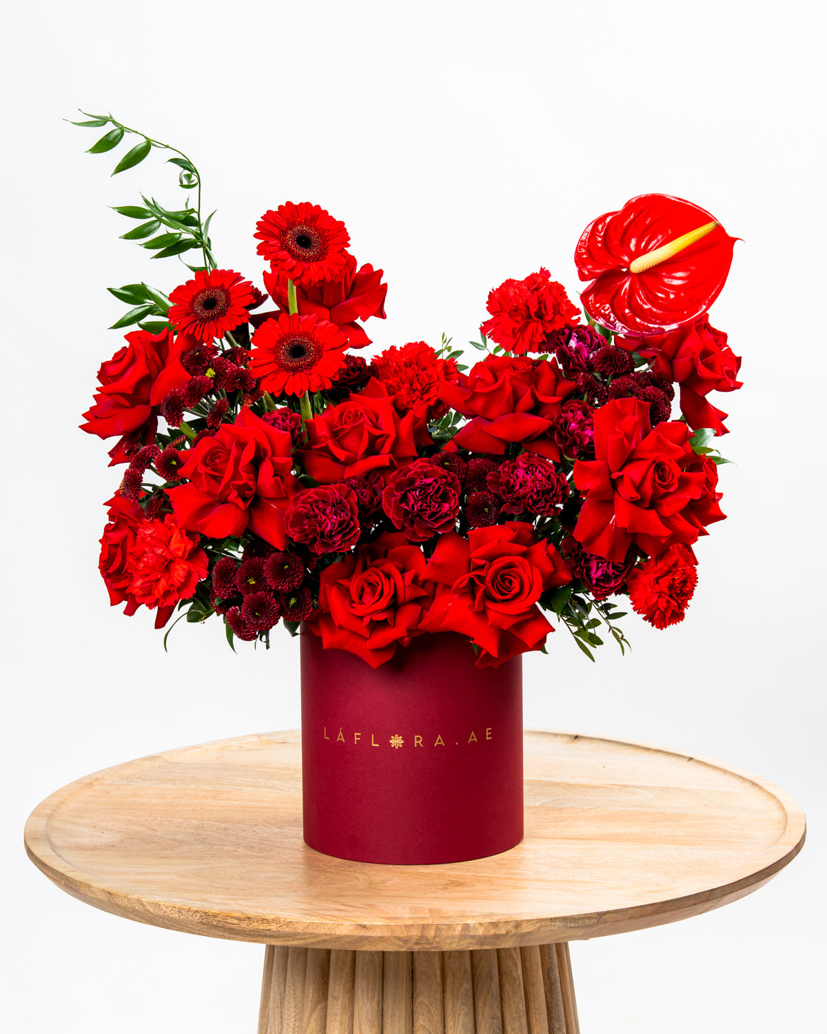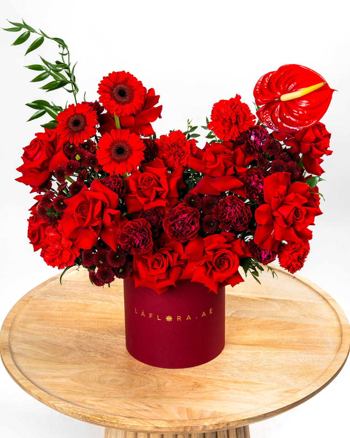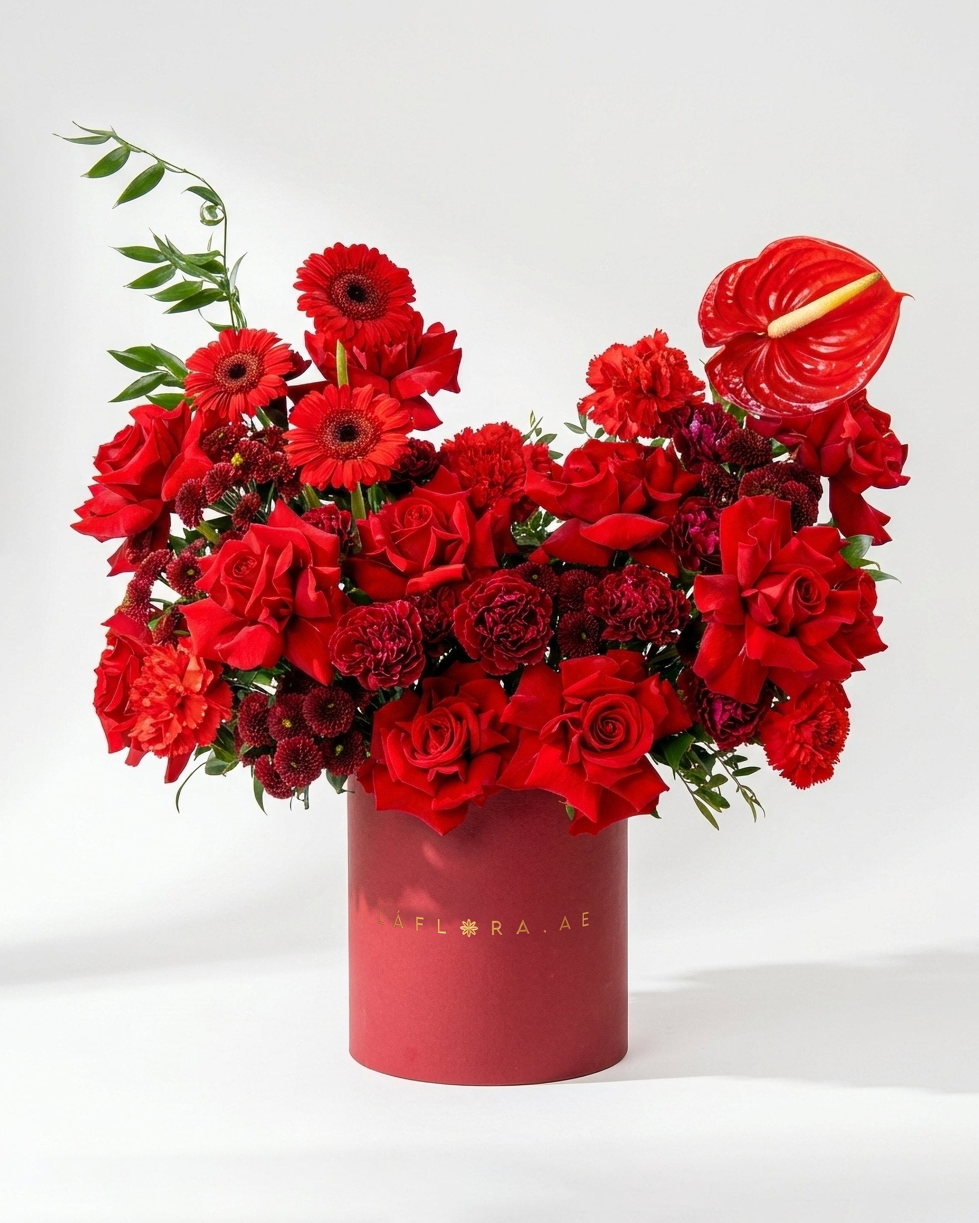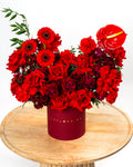 Introducing the Flamora Box, an elegant and fiery arrangement crafted for those who love deep, rich, and expressive colors. This premium design combines Gerbera Mini Red, Red Roses, Red Carnations, Burgundy Carnations, Maroon Santini Chrysanthemums, Red Anthuriums, and lush Italian Ruscus, creating a textured and impactful display.