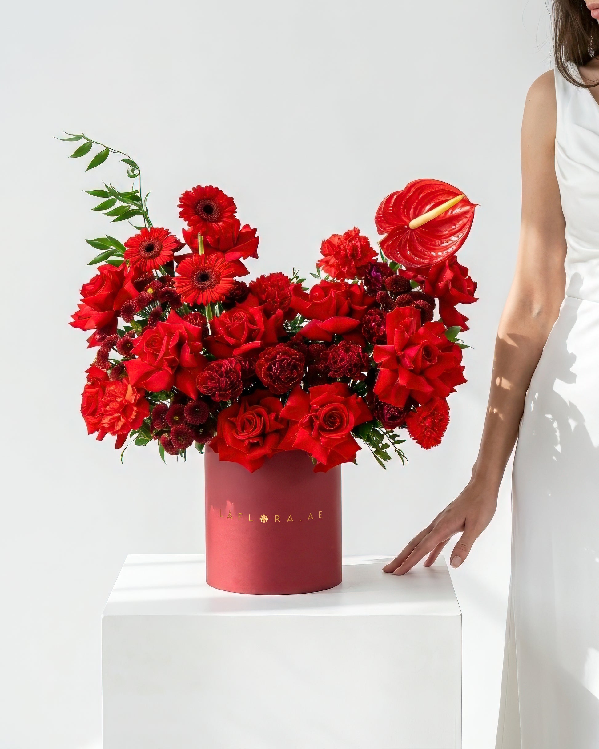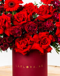The mix of vibrant reds and sophisticated burgundy tones gives the Flamora Box a bold, passionate character ideal for anniversaries, romantic surprises, birthdays, congratulations, or meaningful celebrations. Styled in a luxurious hatbox, it offers depth, contrast, and a refined visual presence suitable for any memorable occasion