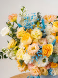 ينبض هذا الباقة المبهجة بالبهجة والأناقة، بمزيجٍ رائع من ورود أوهارا الصفراء، وورود الرش الساحرة، والقرنفل الأبيض، والليزيانثوس الوردي والأبيض الناعم. إضافة زهور أنف العجل الأنيقة تُضفي ارتفاعًا وملمسًا مميزًا، مما يُضفي عرضًا بصريًا ديناميكيًا.