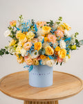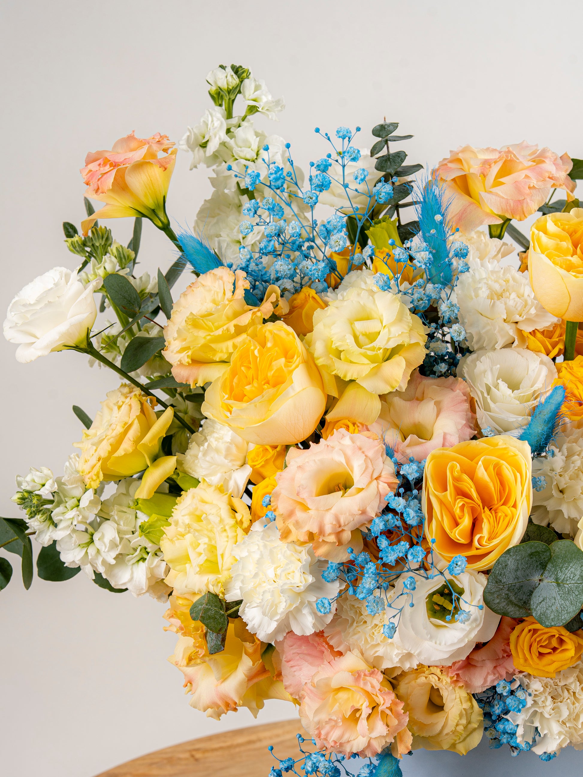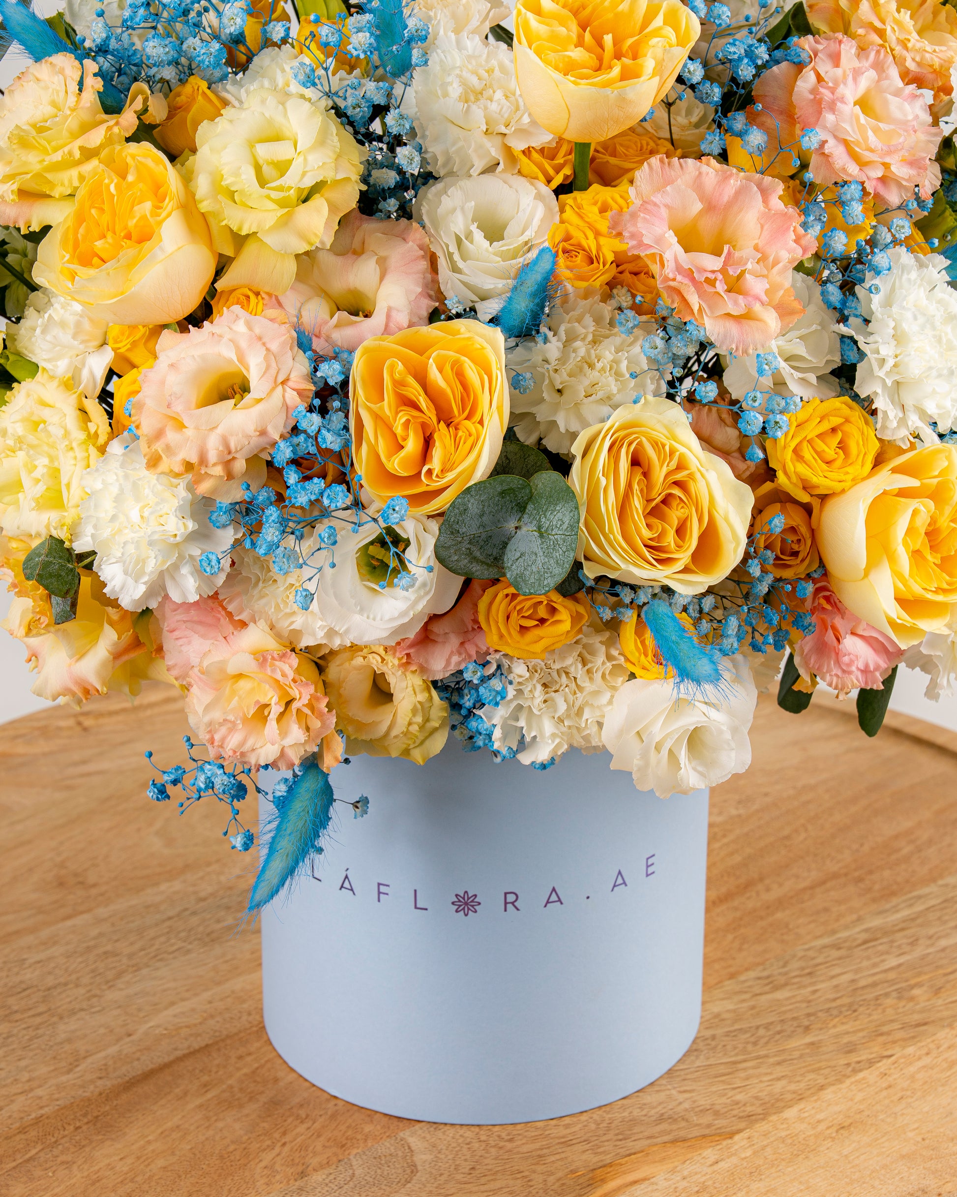 هذه التحفة الزهرية الرائعة، المُرتبة بعناية فائقة في علبة فاخرة زرقاء ناعمة، مثالية للاحتفال بالمناسبات المهمة، أو التعبير عن الامتنان، أو ببساطة إضفاء البهجة على يوم شخص ما. ألوانها الزاهية وتصميمها الفاخر يجعلها هدية رائعة لأي مناسبة.