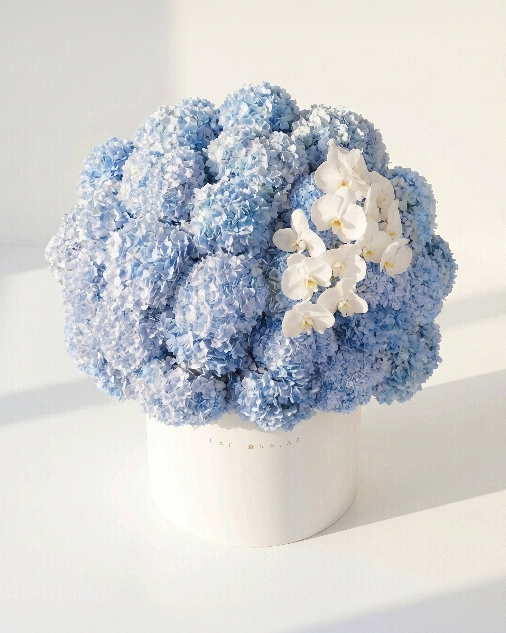 Ideal for birthdays, welcoming a newborn, baby celebrations, or expressing care during heartfelt moments, this arrangement offers understated elegance with strong visual impact. Designed for customers seeking premium flowers, luxury flower delivery in Dubai, and sophisticated hydrangea Flower Boxes with a minimalist aesthetic