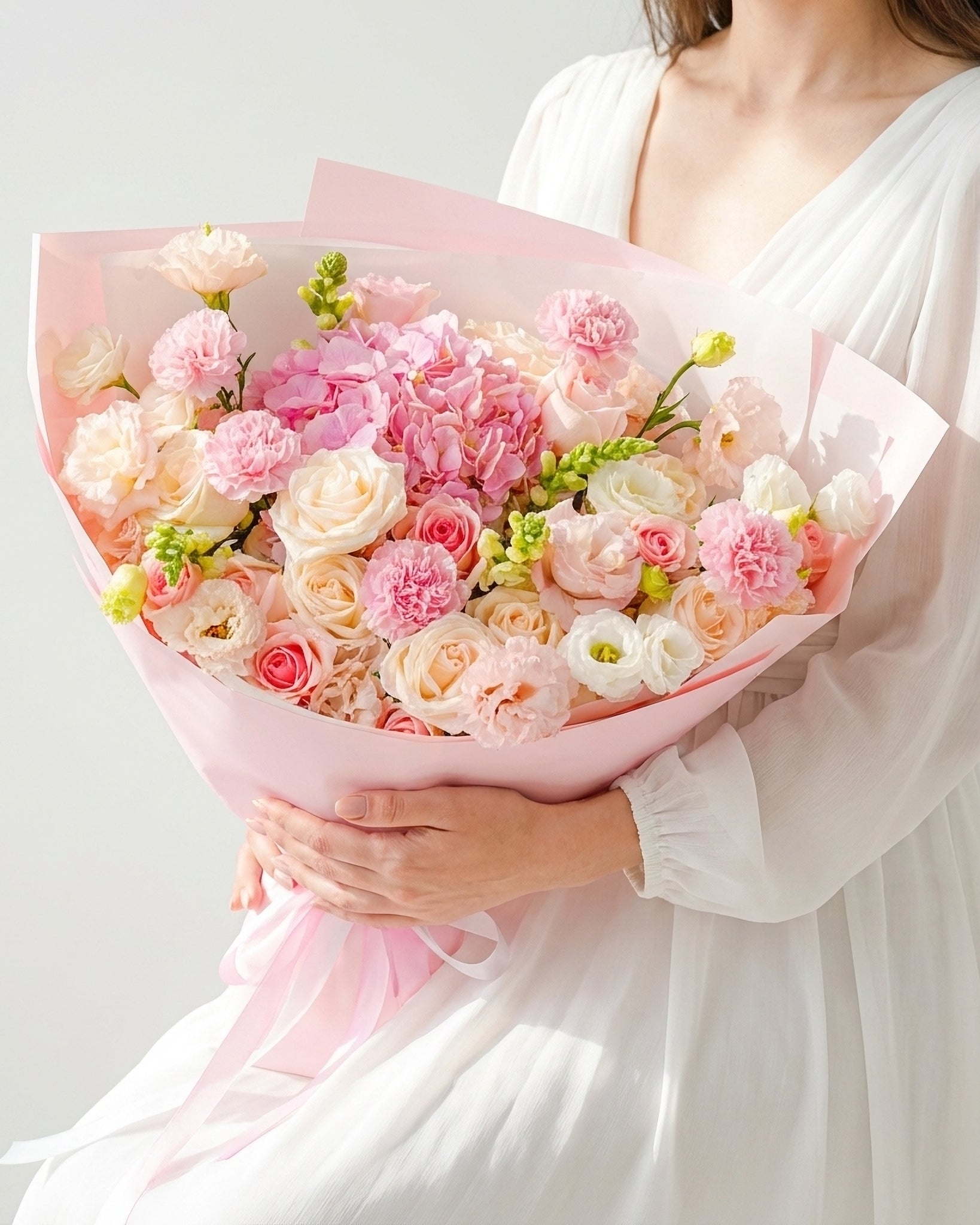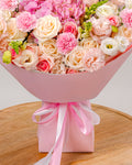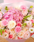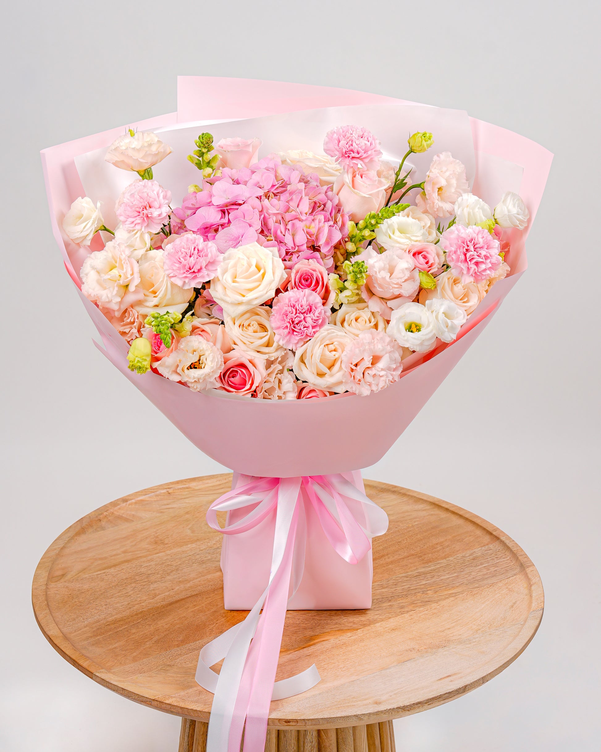 The Blush Muse Bouquet is a stunning composition of soft Hydrangeas, Roses, Carnations, Lisianthus, and Snapdragons, thoughtfully designed in soothing pastel shades. Each bloom is selected for its freshness and beauty, creating a gentle and timeless arrangement that brings elegance and serenity to any space.