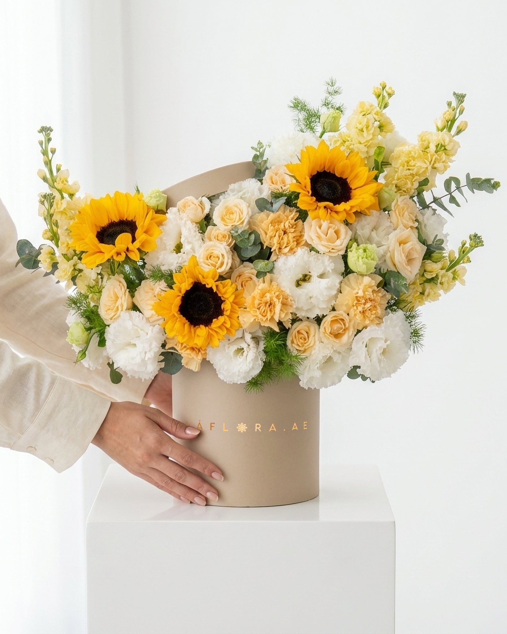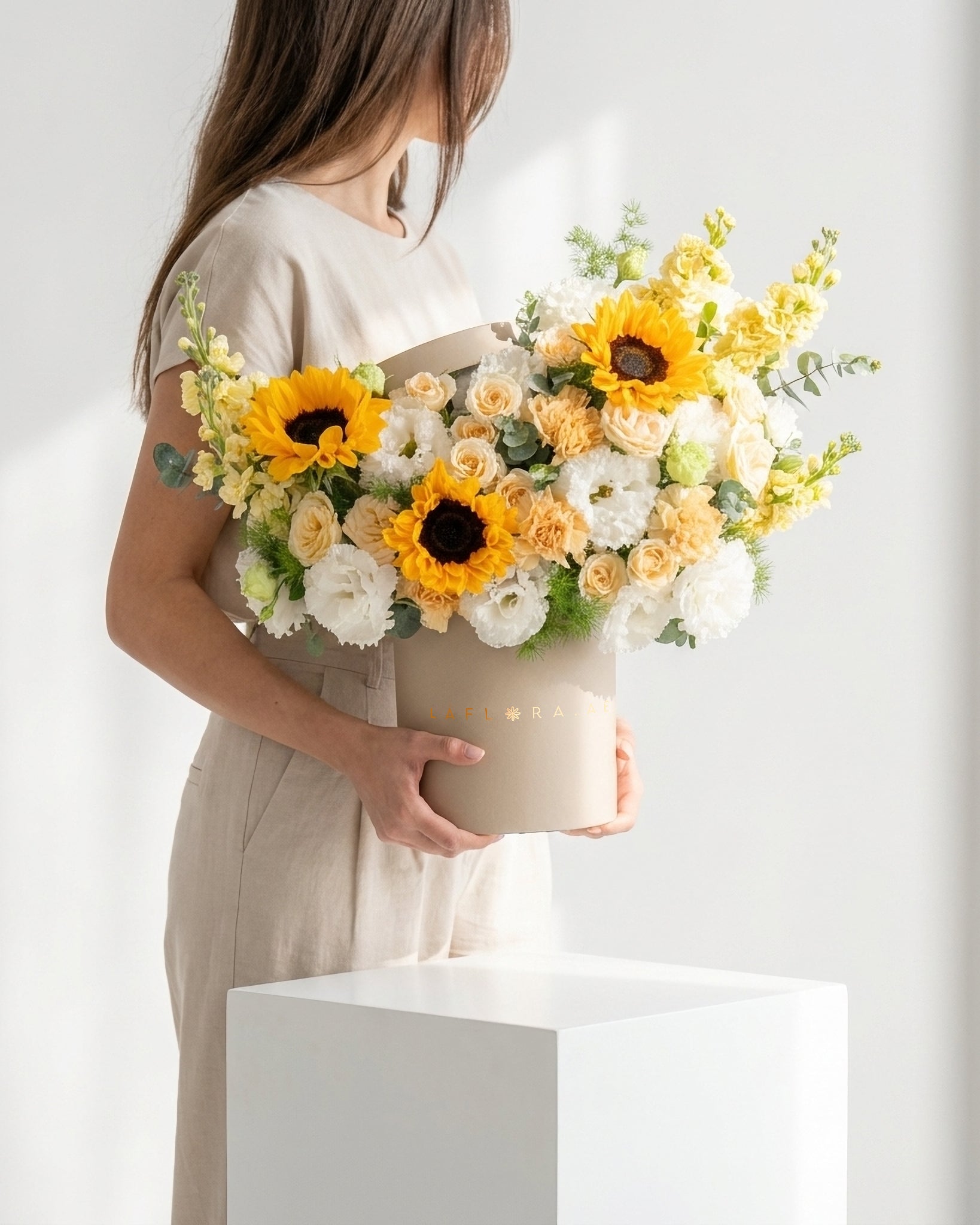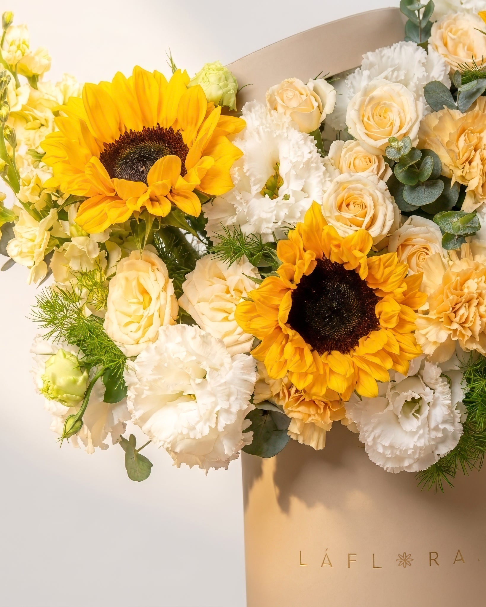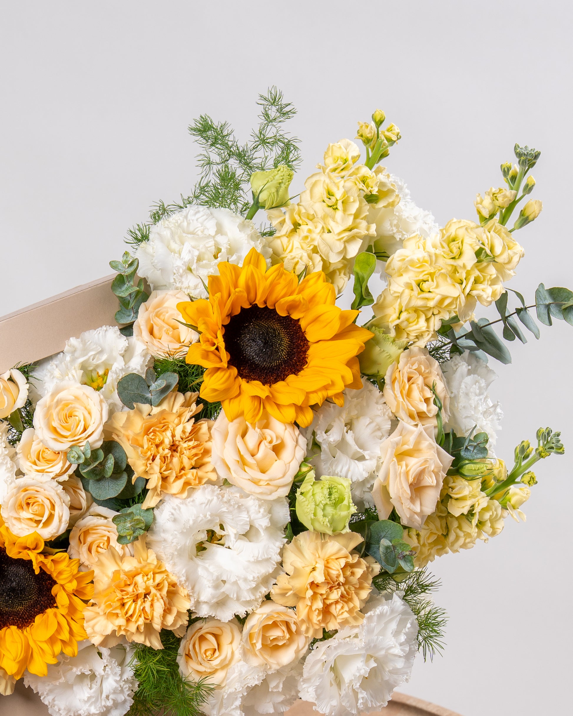 Introducing the Solara Box, a vibrant floral arrangement designed to infuse light and happiness into any occasion. This arrangement centers around golden sunflowers, paired with lush carnations, delicate eustoma, fragrant spray roses, gentle mattiola, soft asparagus and eucalyptus, creating a lively and harmonious blend of texture, color, and freshness.