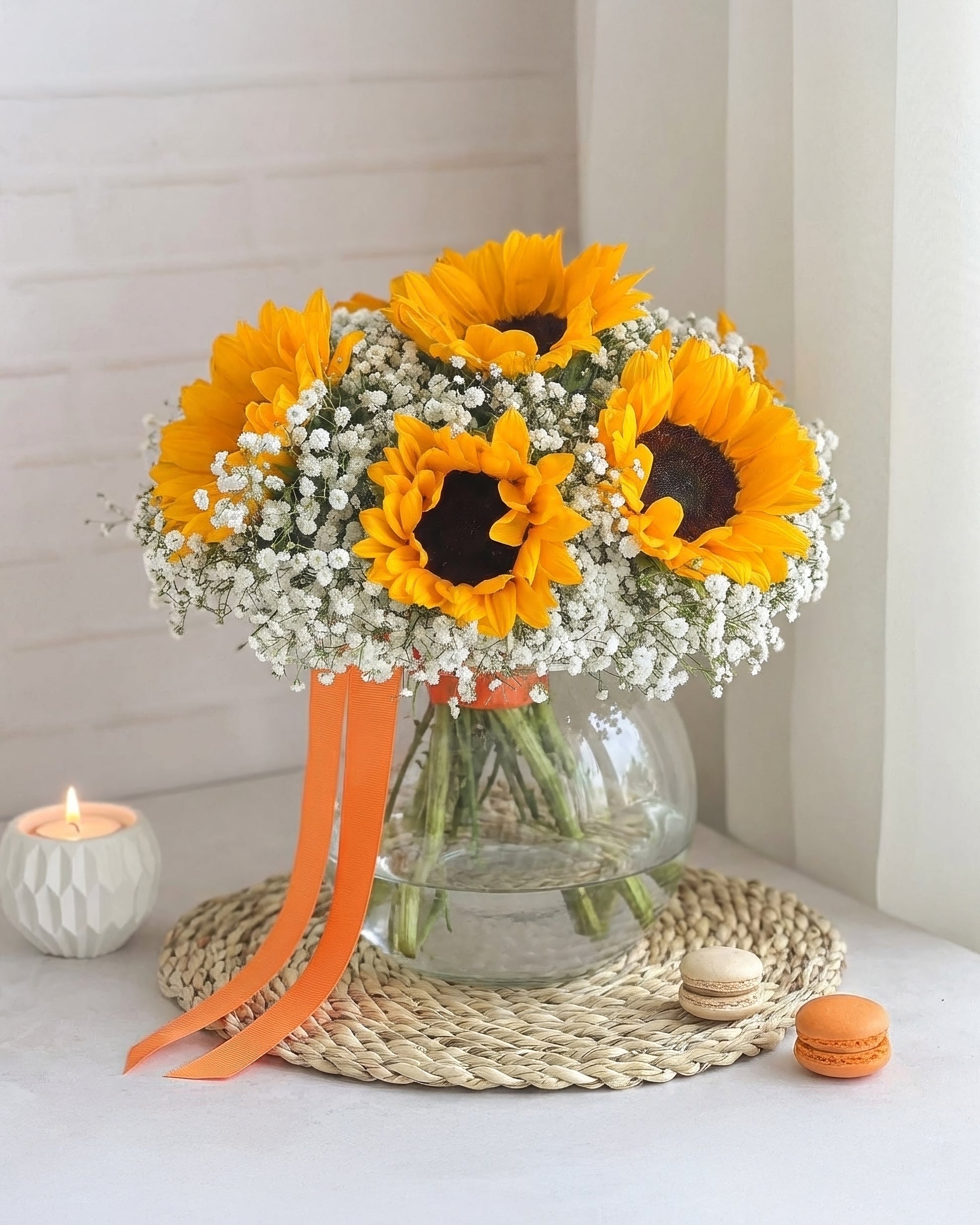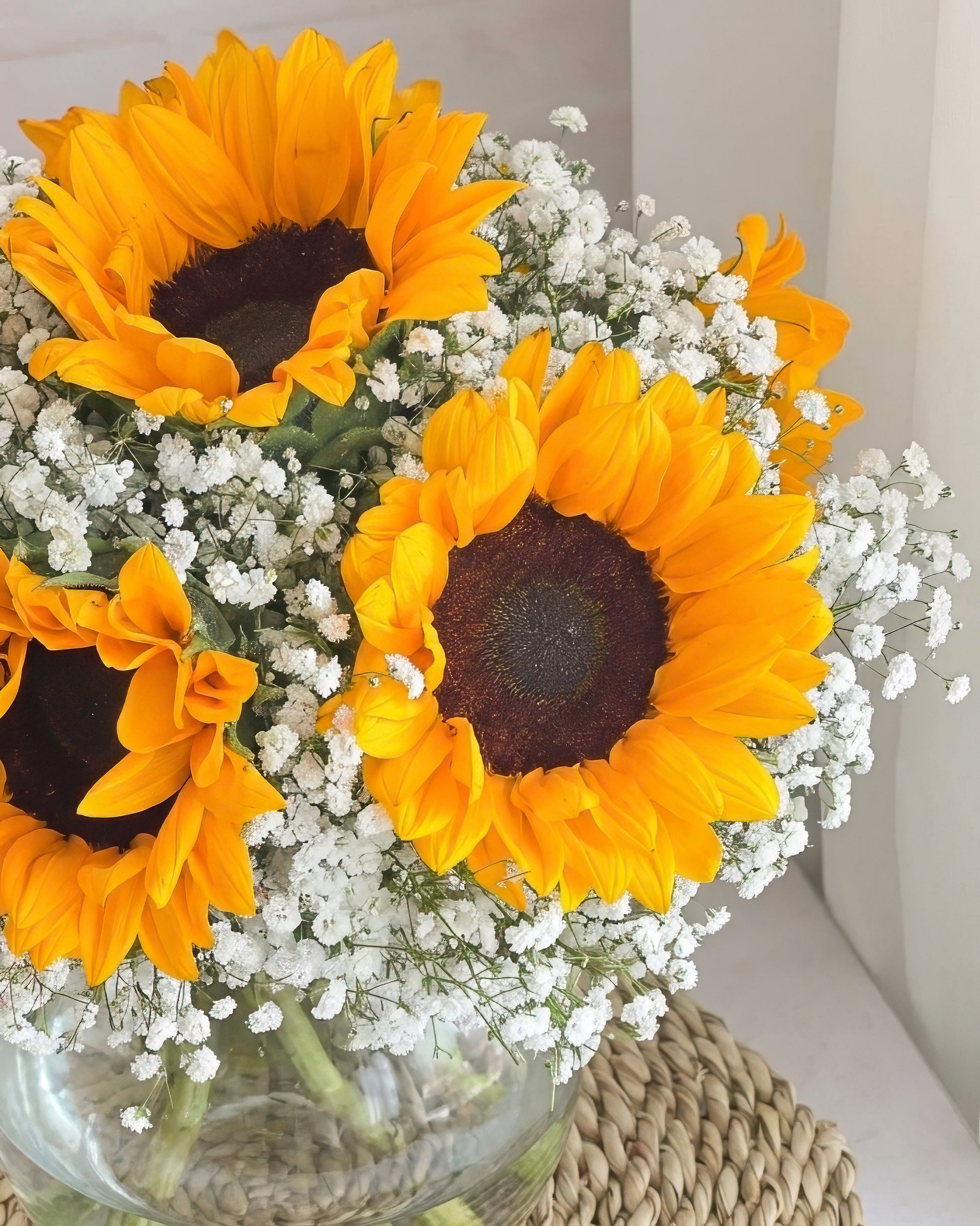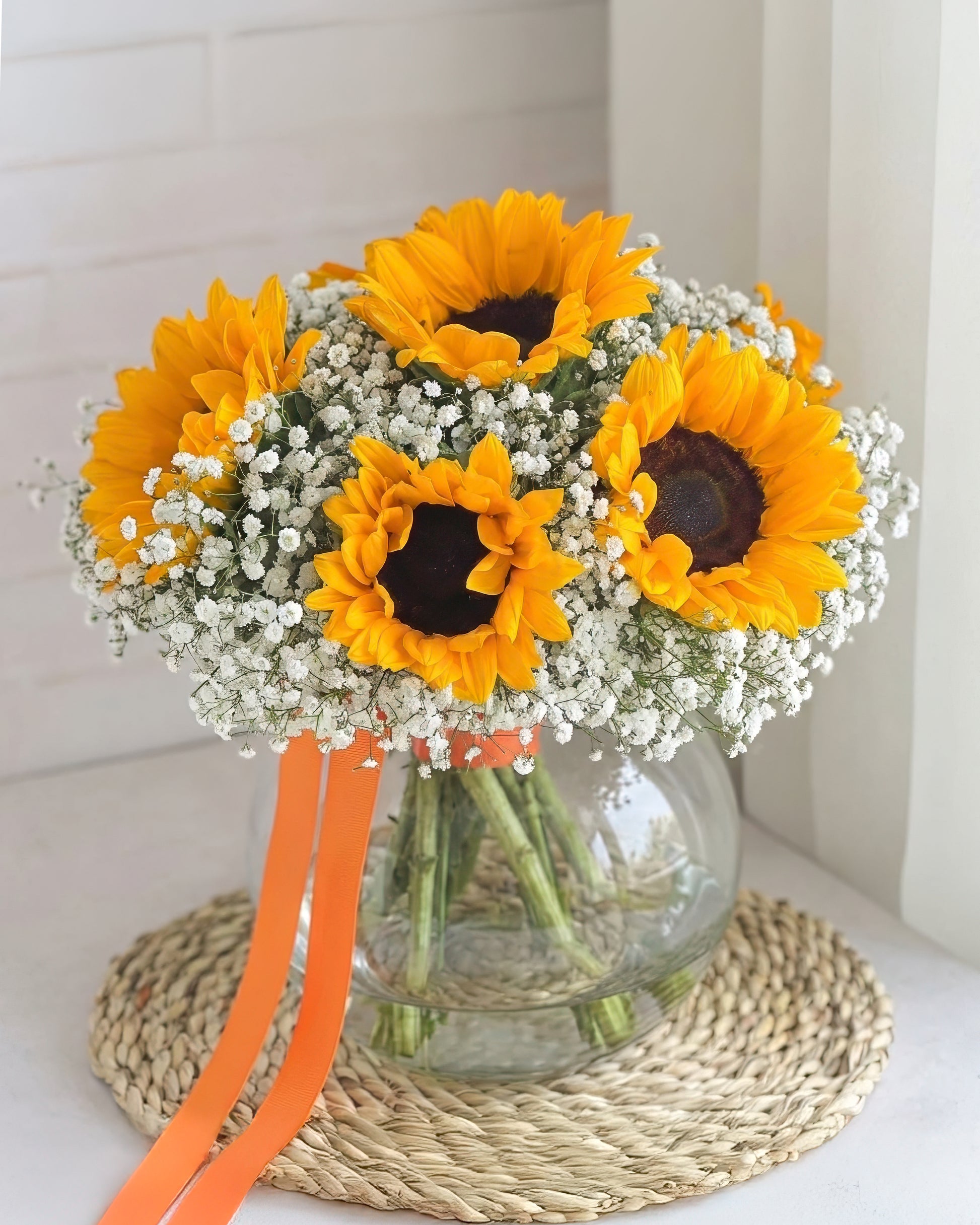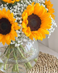 أضف البهجة إلى أي غرفة أو مناسبة مع مزهرية Sunshine Bloom، وهي عبارة عن ترتيب مشع مصمم لنشر البهجة والإيجابية. تتميز هذه الترتيبات بزهرة عباد الشمس الصفراء المشمسة جنبًا إلى جنب مع سحر أنفاس الطفل اللطيف، وهي مثالية للاحتفال باللحظات الخاصة أو ببساطة إضافة لمسة مبهجة إلى مساحتك. يتم عرضها بأناقة في مزهرية زجاجية أنيقة، وهي هدية مثالية لأعياد الميلاد أو حفلات الانتقال إلى منزل جديد أو كمفاجأة مدروسة.