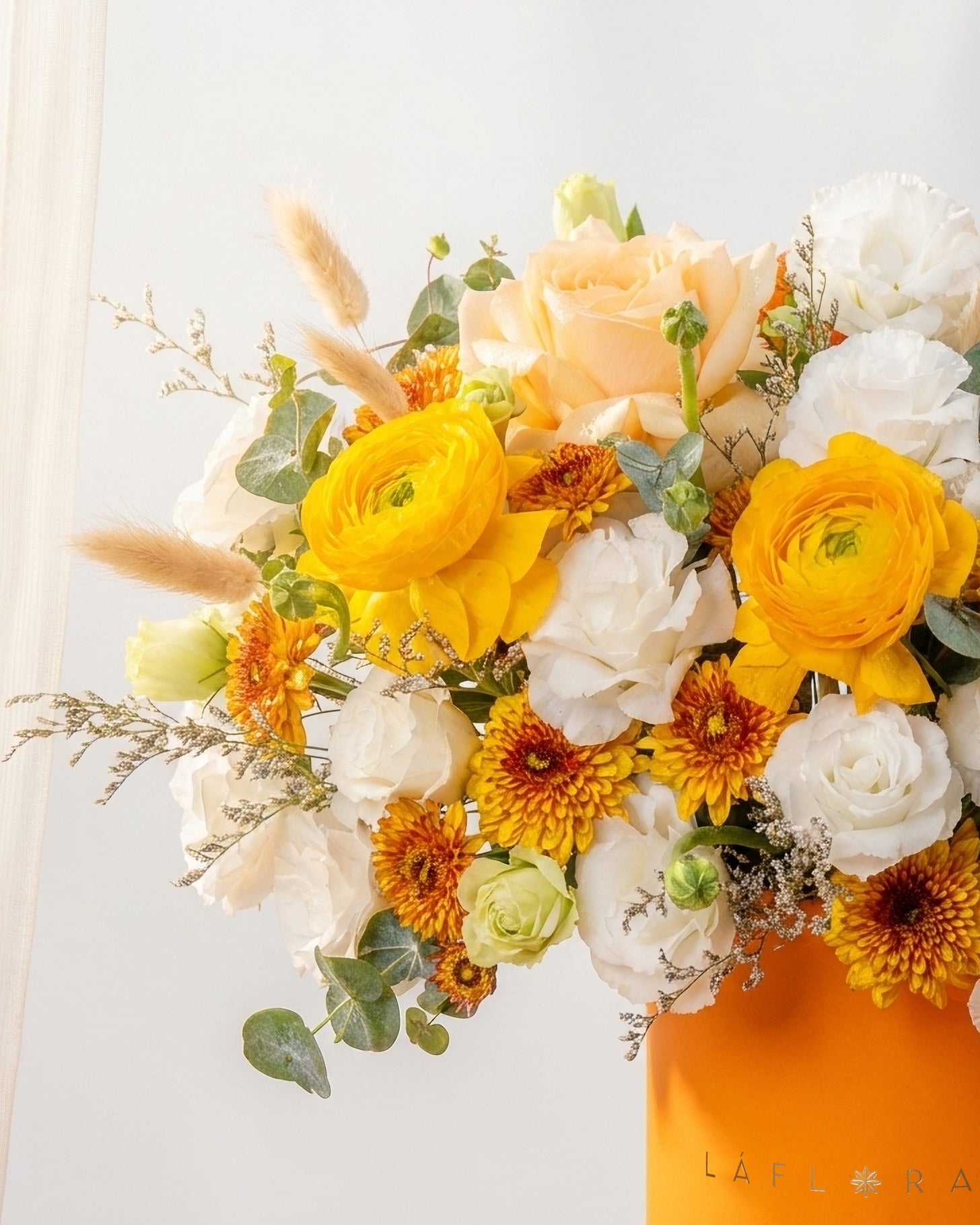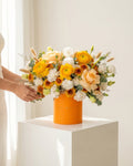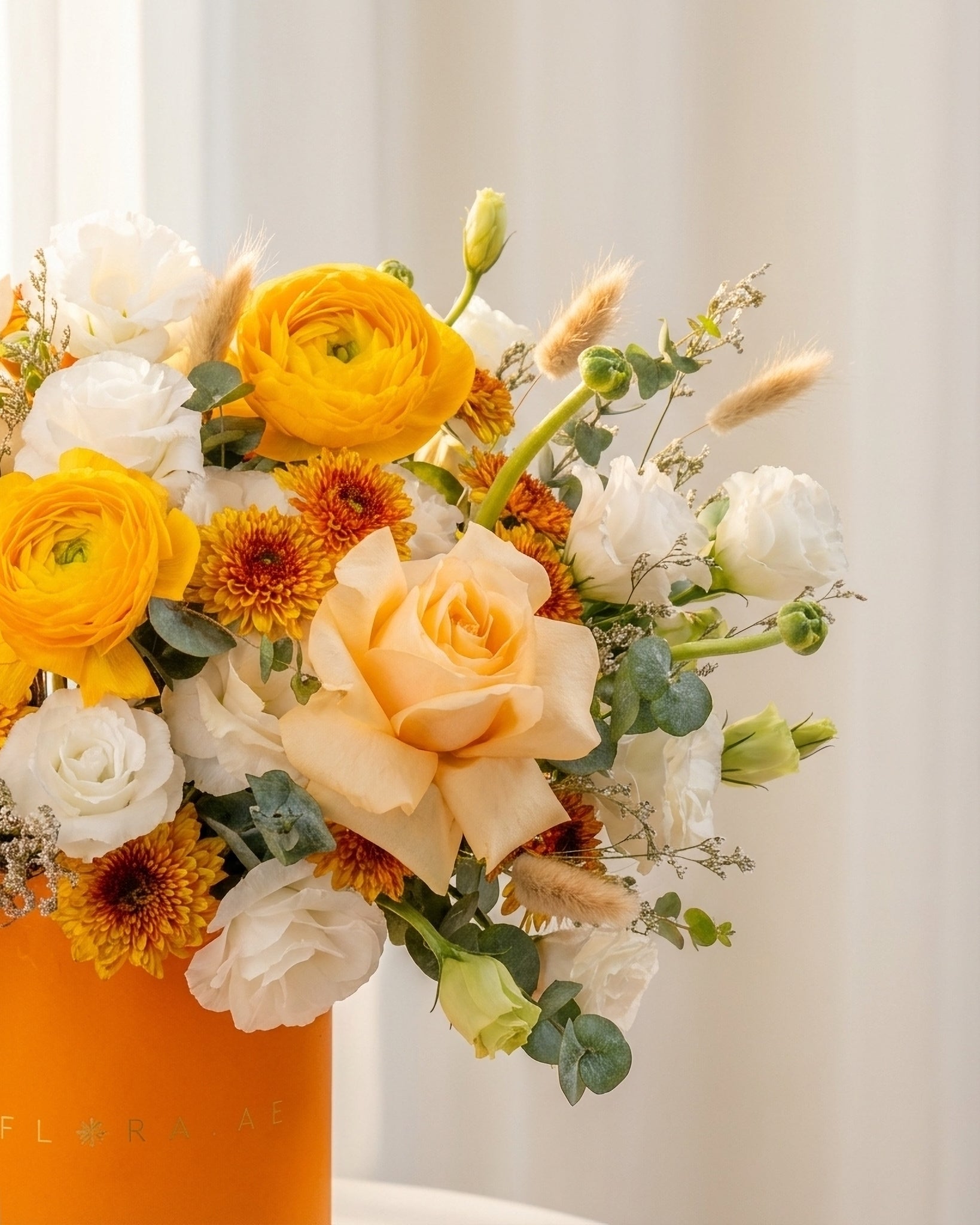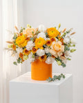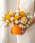 Radiate happiness and warmth with the Sunshine Ranunculus Box flower box, a masterpiece of color designed to lift spirits instantly. This arrangement is a harmonious blend of energetic citrus tones and calming creamy hues, expertly curated by our florists to capture the vibrant energy of Dubai.