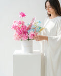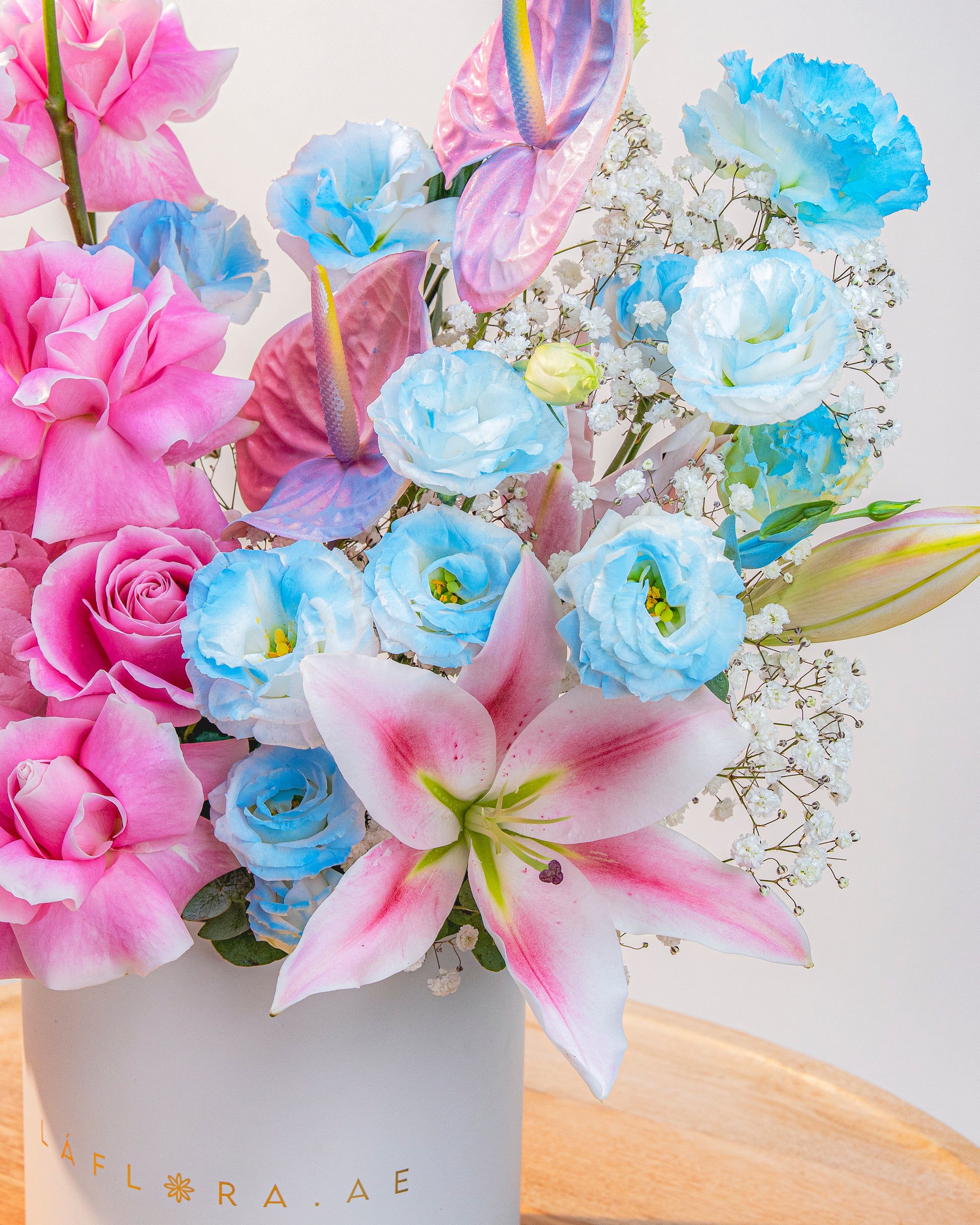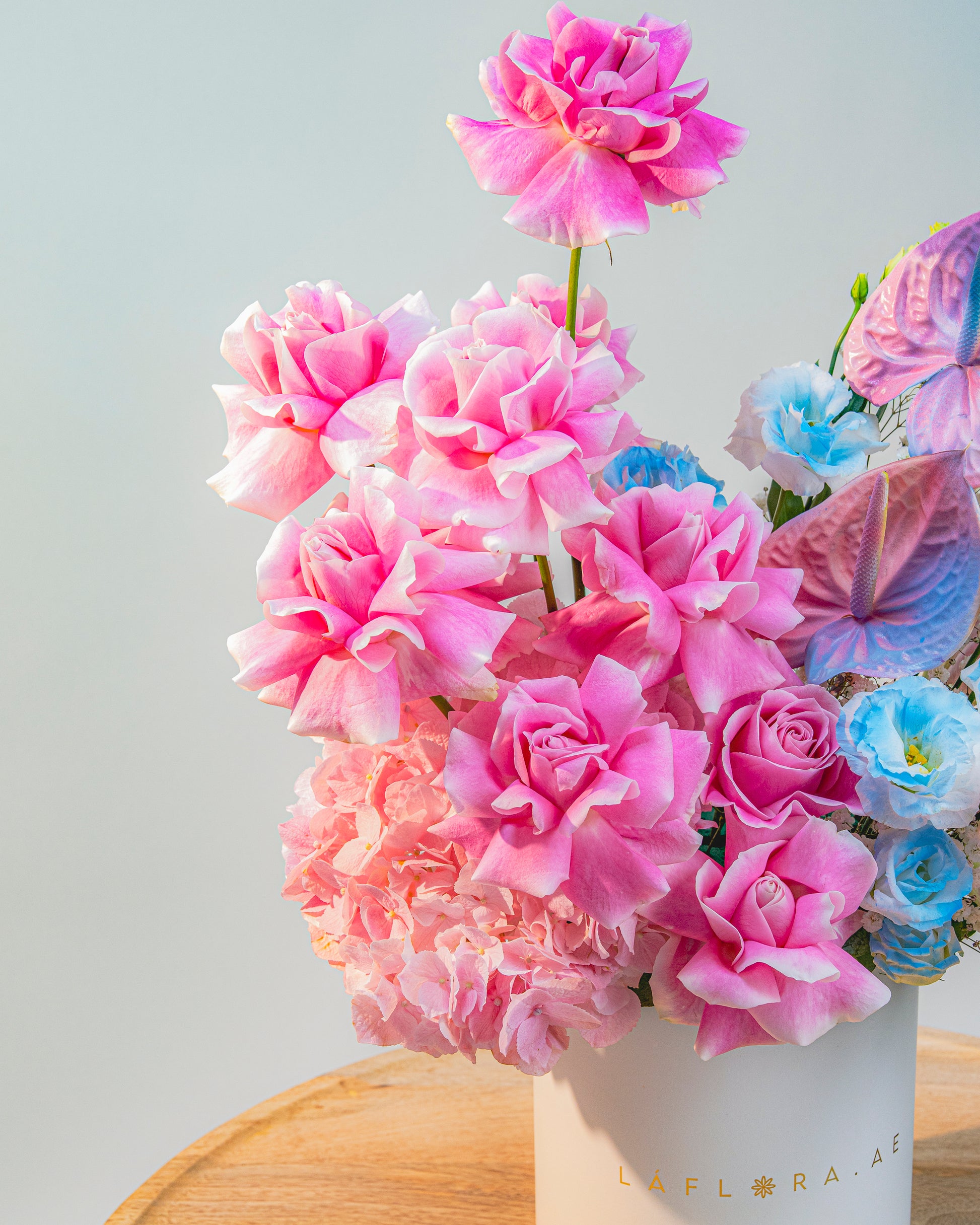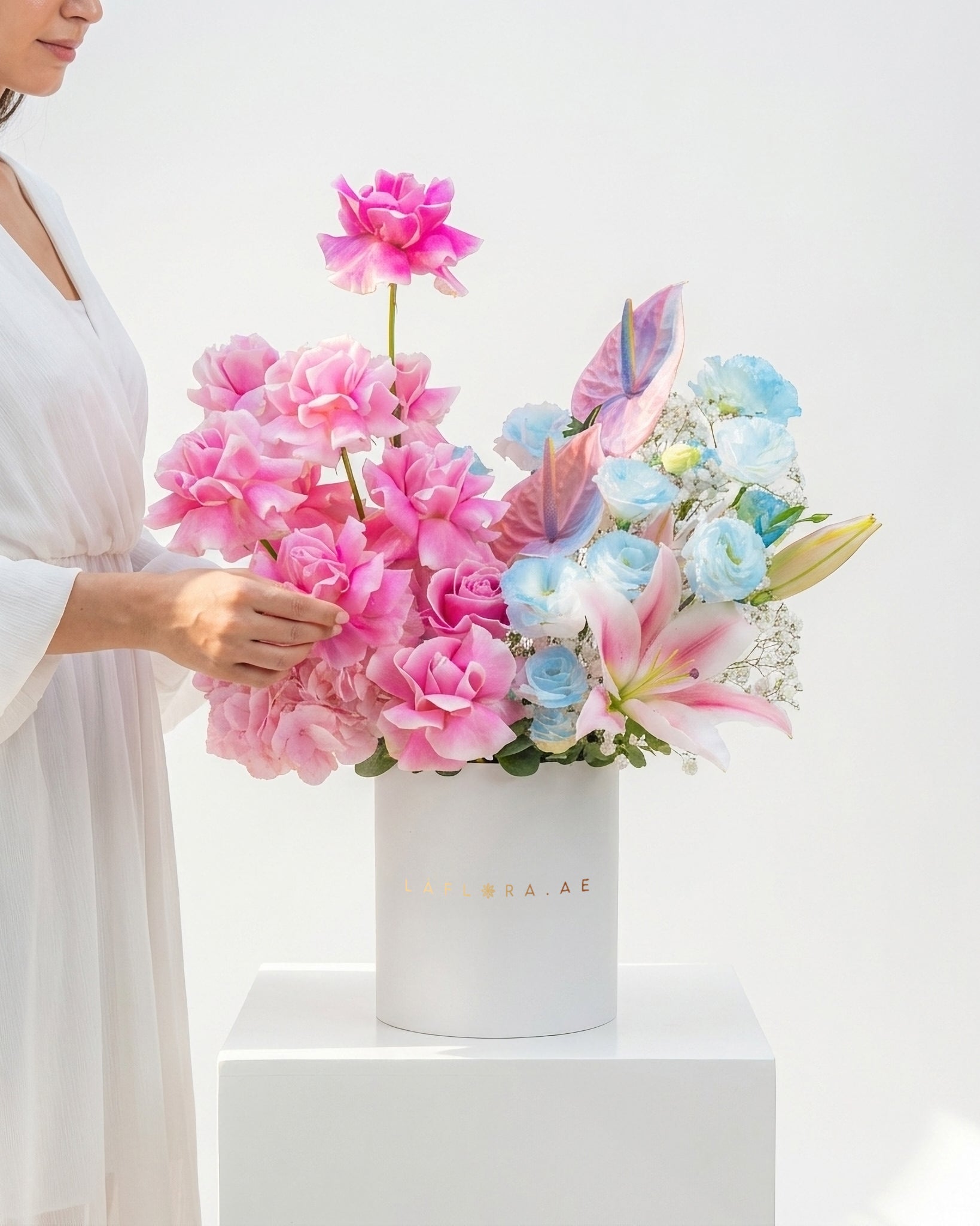 Sweet Blooms Box is a soft, heartfelt expression crafted with a luxurious mix of Vendela Rosita Pink roses, lush Pink Hydrangea, elegant White Lisianthus, fragrant Pink Lilies, airy Gypsophila, and statement Anthurium, all styled in Laflora’s signature Premium White Box.
