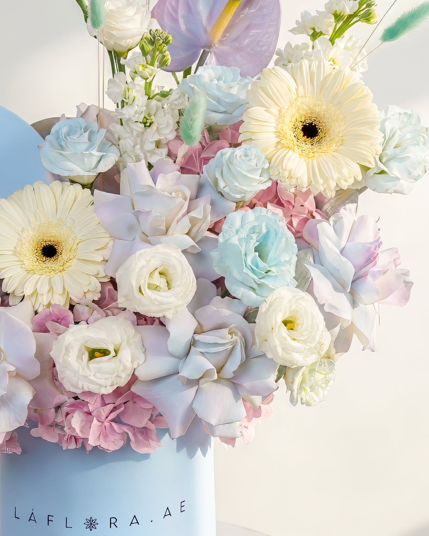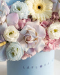 Discover calm, airy elegance with the Azure Cloud Flower Box, a luxurious arrangement crafted in Laflora’s signature light-blue premium hatbox. This design features a refined mix of White Vendela Roses, White Mattiola, White Gerbera, Sprayed Anthurium, Pink Hydrangea, White Eustoma, and a soft touch of Blue Pampas, creating a balanced and cloud-like visual flow.