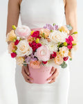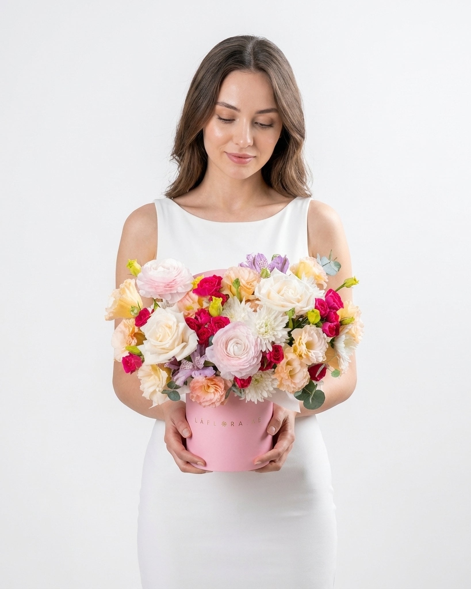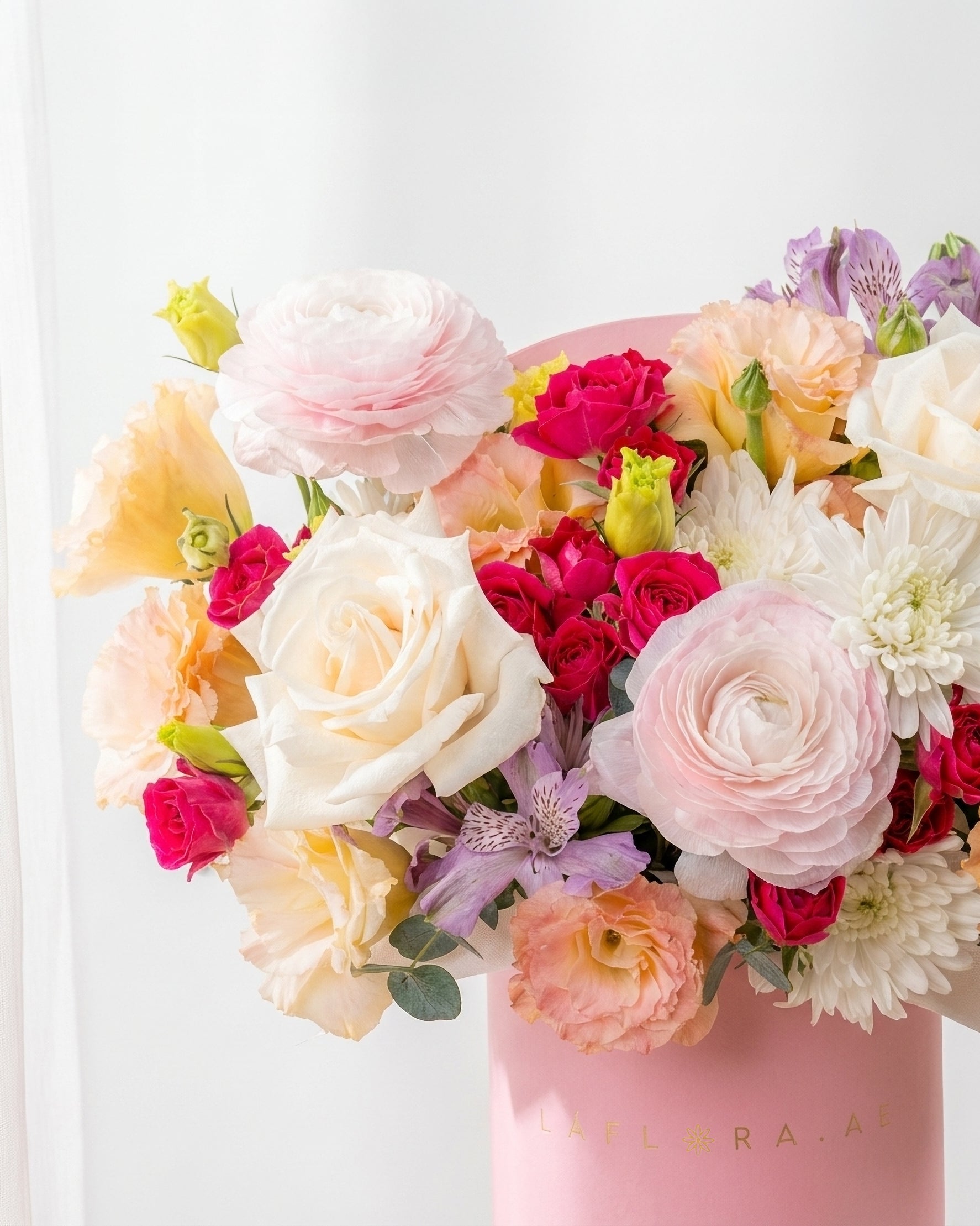 The Blush Ranunculus Flower Box is a stunning expression of love, gratitude, and celebration. Featuring exquisite white ranunculus, spray chrysanthemums, peach eustoma, fuchsia spray roses, light purple alstroemeria, and Vendela white roses, complemented by aromatic eucalyptus, this arrangement is crafted to impress. Ideal for birthdays, anniversaries, or surprise gifts, each box delivers joy and elegance. Enjoy same-day flower delivery in Dubai and next-day delivery across all Emirates.