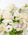Spray chrysanthemums and ping pong chrysanthemums symbolize loyalty, support, and enduring relationships, while white eustoma adds softness and emotional honesty. The soothing presence of green hydrangea represents renewal, balance, and heartfelt understanding, enhanced by lipinium, delicate dry accents, and layered greenery covering the back for a naturally elegant finish.