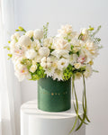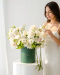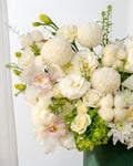 Presented in a refined flower box, the white and green color palette signifies peace, hope, and destiny unfolding with grace making this arrangement especially suitable for sympathy and condolence gestures, anniversaries, corporate gifting, housewarmings, and meaningful life milestones.
