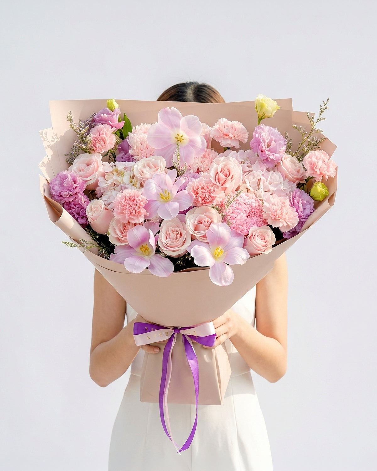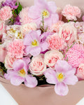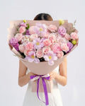 Fairy Tale Bouquet captures the magic of meaningful moments through a delicate harmony of blush pink and purple blooms. Thoughtfully composed with fresh hydrangeas, elegant tulips, chrysanthemum peonies, lisianthus, carnations, roses, and airy limonium, this bouquet tells a story of romance, tenderness, and quiet luxury.