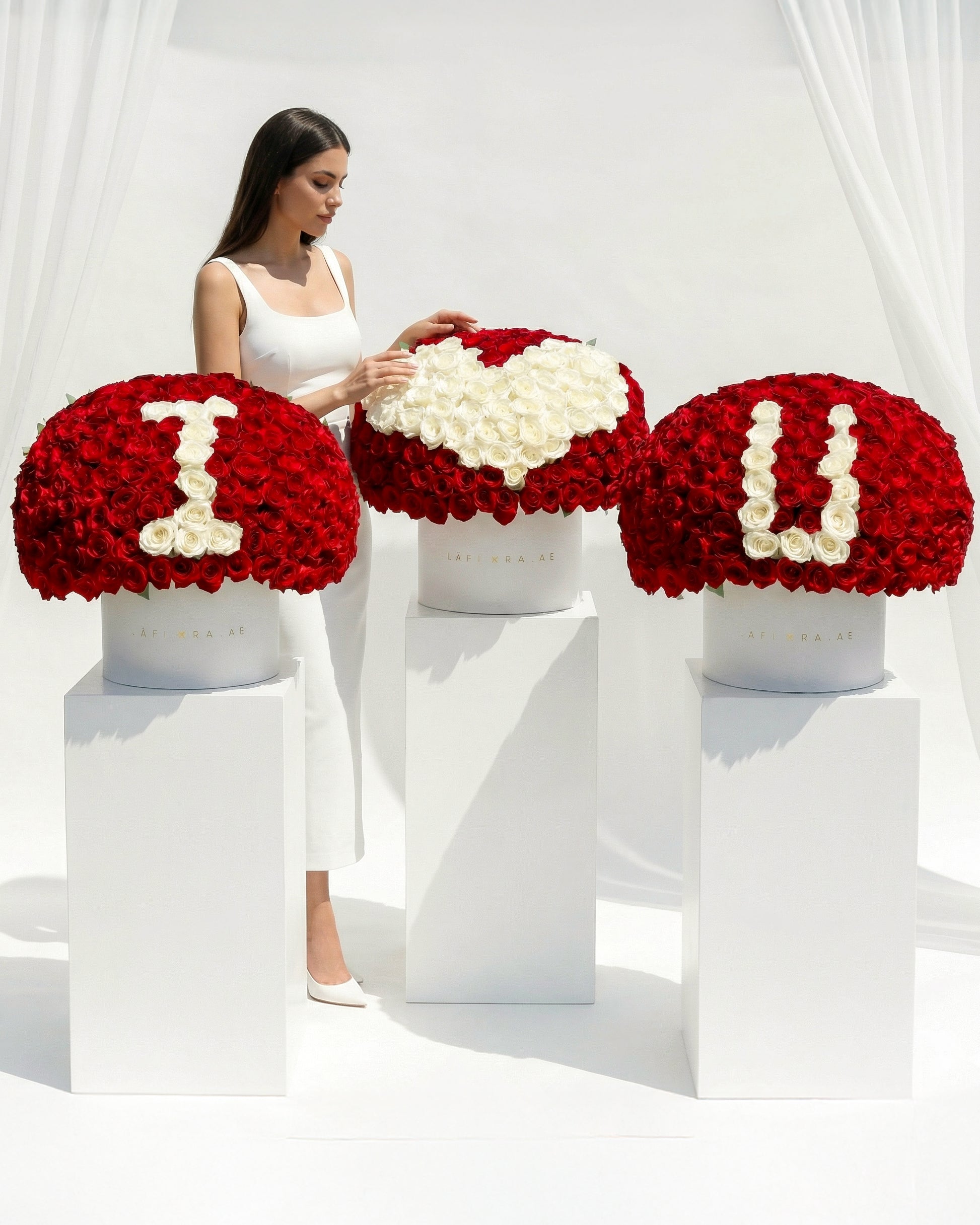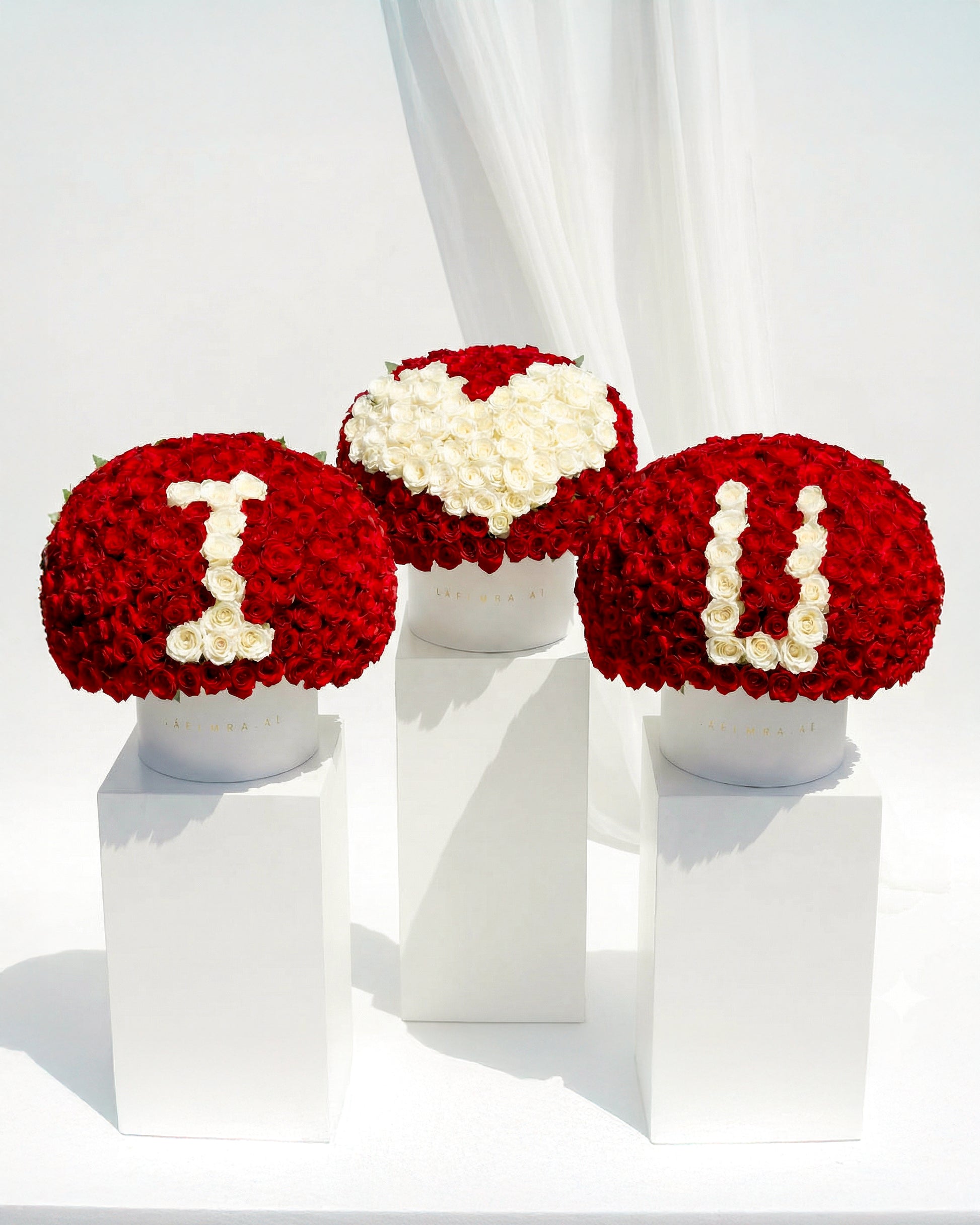 Make an unforgettable declaration of love with the I Love You Luxury Box, an extraordinary three-piece floral masterpiece designed to impress at first sight. This iconic arrangement features luxurious red roses paired with pristine white roses, forming the letters “I” and “U” with a heart at the center—together spelling “I Love You” in elegant contrast. Each box showcases a front-facing half-dome design for maximum visual impact, while the back is beautifully finished with a hatbox cap and lush greenery. Every box contains 200 handpicked premium roses, bringing the total to an exceptional 600 roses. Sourced daily from the world’s finest farms, these roses offer rich color, superior freshness, and a shelf life of 5–7 days. Expertly crafted by Laflora’s florists, this is romance at its most grand.