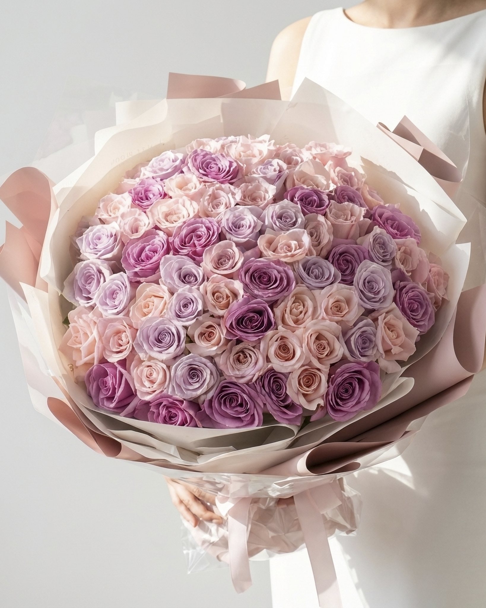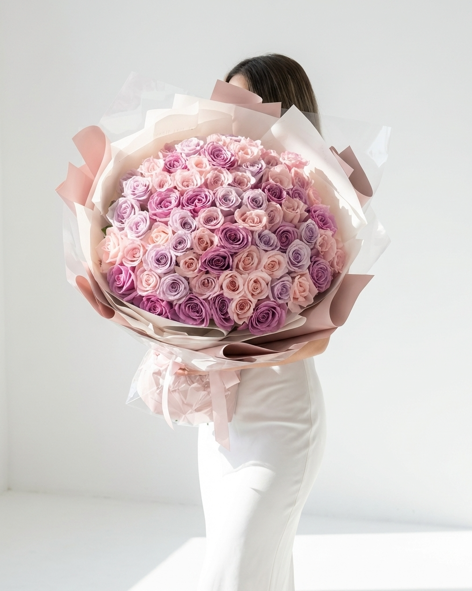 Make a lasting impression with the Lavender Blush Bouquet, a luxurious arrangement of roses transitioning from deep violet to soft blush, creating a mesmerizing ombré effect. Wrapped in premium paper, this grand bouquet exudes elegance and sophistication, ideal for birthdays, anniversaries, or heartfelt celebrations. Purple roses symbolize admiration and enchantment, while pink conveys love and gratitude together expressing a timeless message of affection. Delivered by Laflora, Dubai’s trusted flower shop, with same-day delivery, this exquisite bouquet ensures freshness, luxury, and a personal touch, making it the perfect gift for someone special.