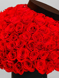 Celebrate love and special moments with our Red Roses Deluxe Flower Box, featuring 50 hand-selected, premium red roses. Expertly arranged in a dome shape, the front-facing roses create height and fullness, while the back is elegantly covered with lush greenery for a balanced, luxurious look.