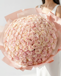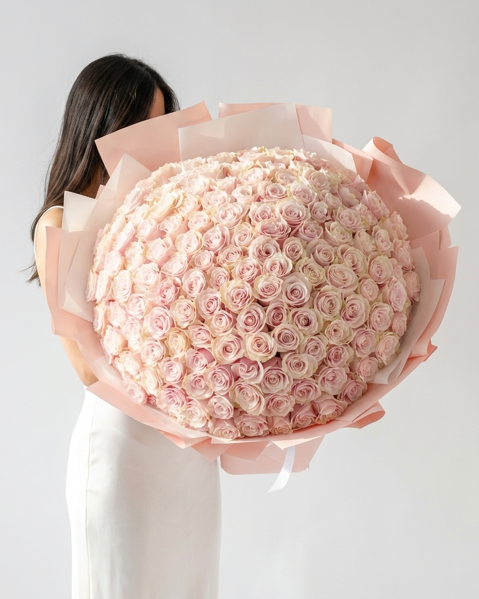 Make a statement with this luxurious grand bouquet of light pink roses, designed to captivate at first glance. Each rose is hand-selected and meticulously arranged into a dense, perfectly rounded dome, creating a lush, full-bodied display that exudes elegance and romance. Wrapped in soft pastel pink layers, the bouquet is beautifully framed, adding sophistication and a touch of luxury to every detail.