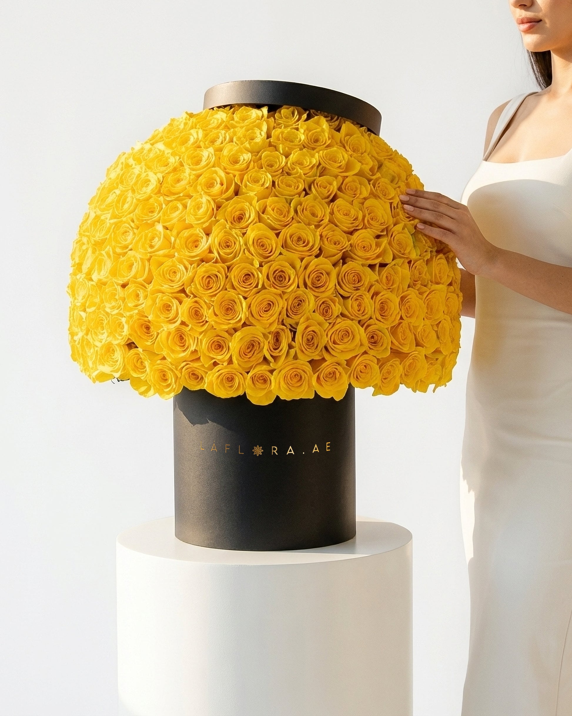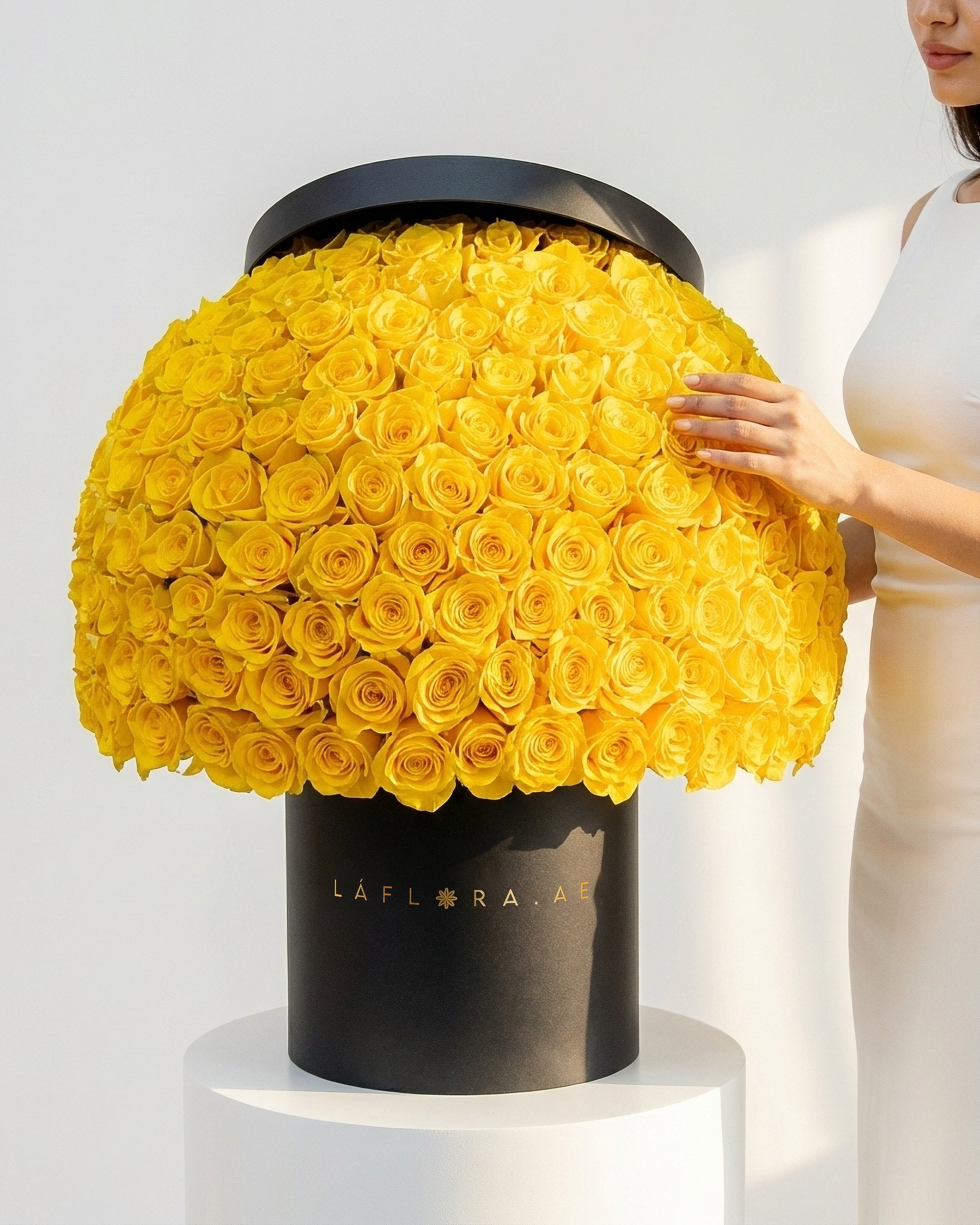 Capture the warmth of the sun and make an unforgettable impression with the Golden Dome Luxury Yellow Rose Arrangement. This is the ultimate statement piece for grand gestures, offering unparalleled joy and opulence. As a premier online florist in Dubai, we ensure that this bespoke arrangement reflects the highest standards of luxury and customization.