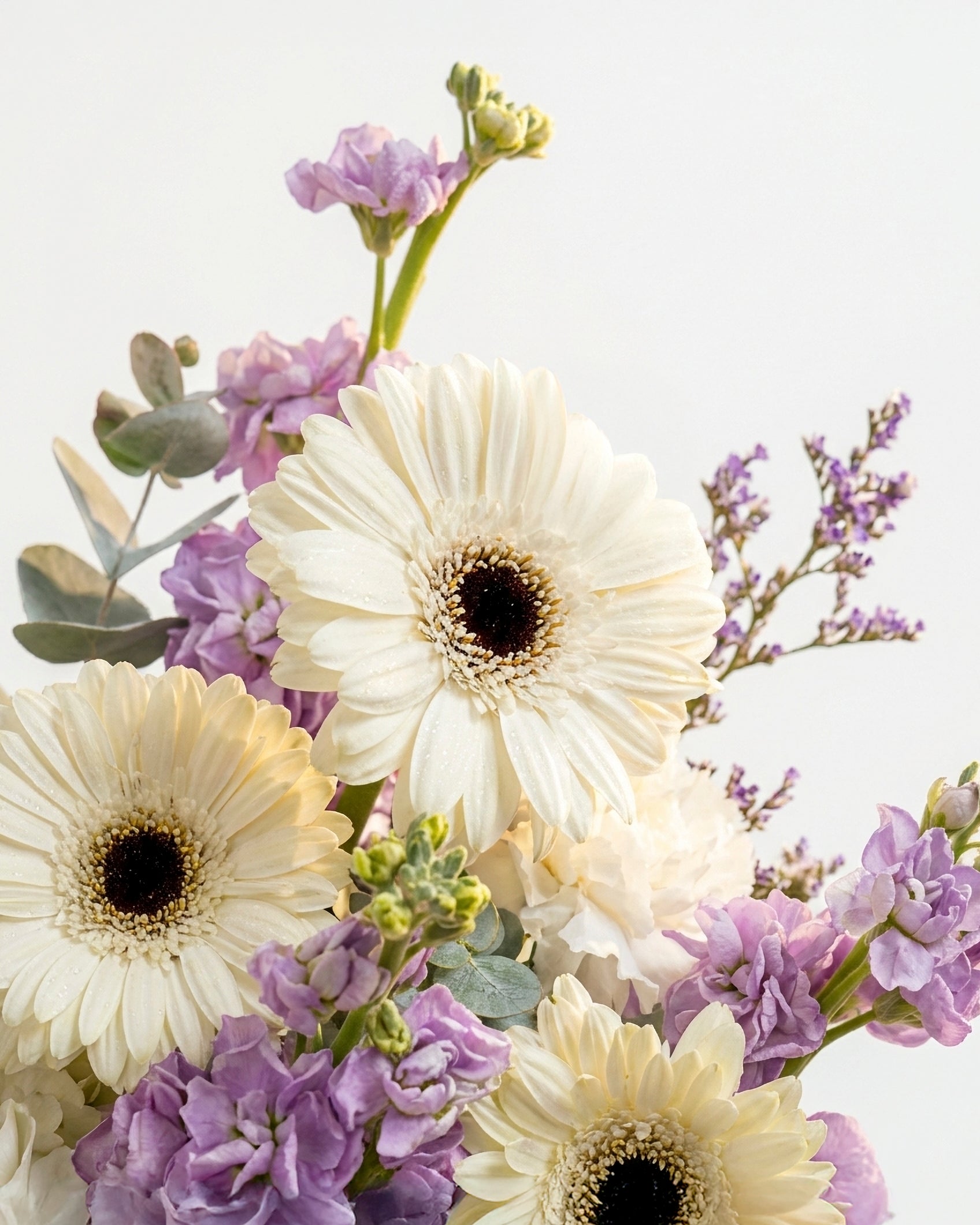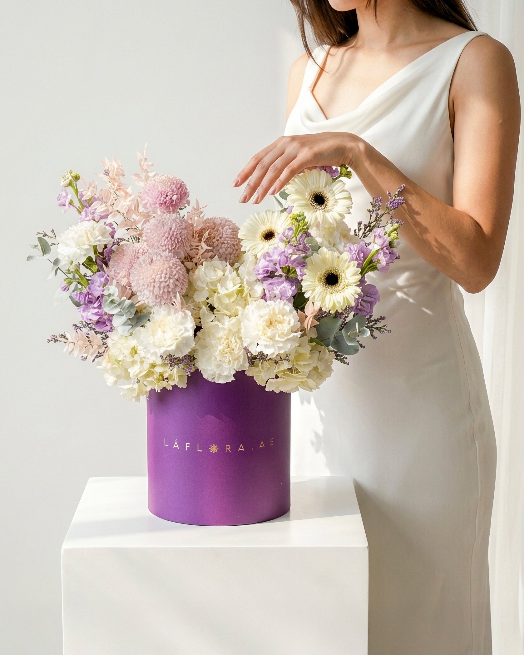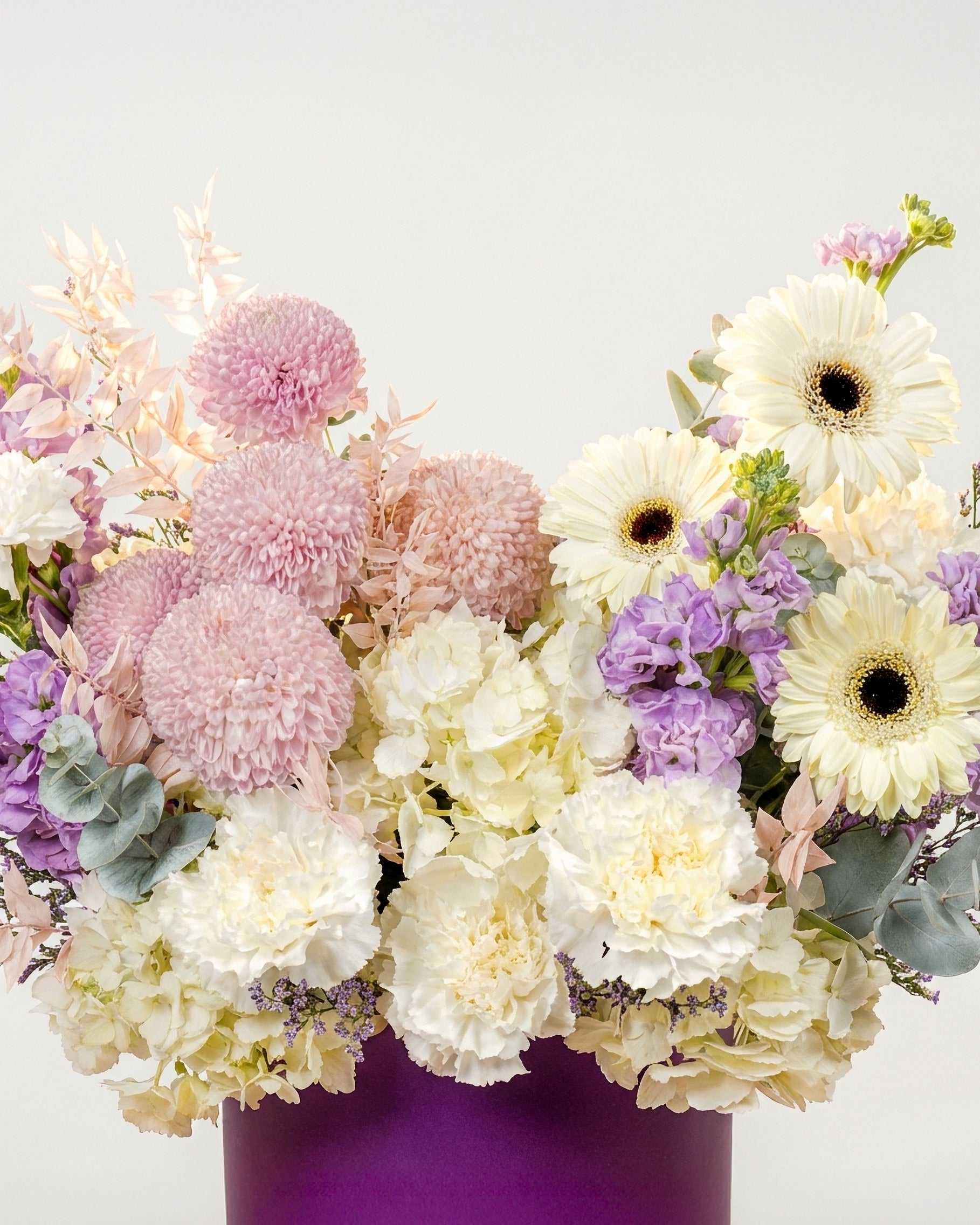 The Nebula Dreams Box is a graceful expression of calm emotions and quiet beauty. Featuring crisp white gerberas, hydrangea, and carnations paired with striking purple ping pong chrysanthemums, matthiola, and limonium, this arrangement balances softness with depth. Finished with eucalyptus and presented in Laflora’s new purple box, the design feels modern, refined, and effortlessly elegant.