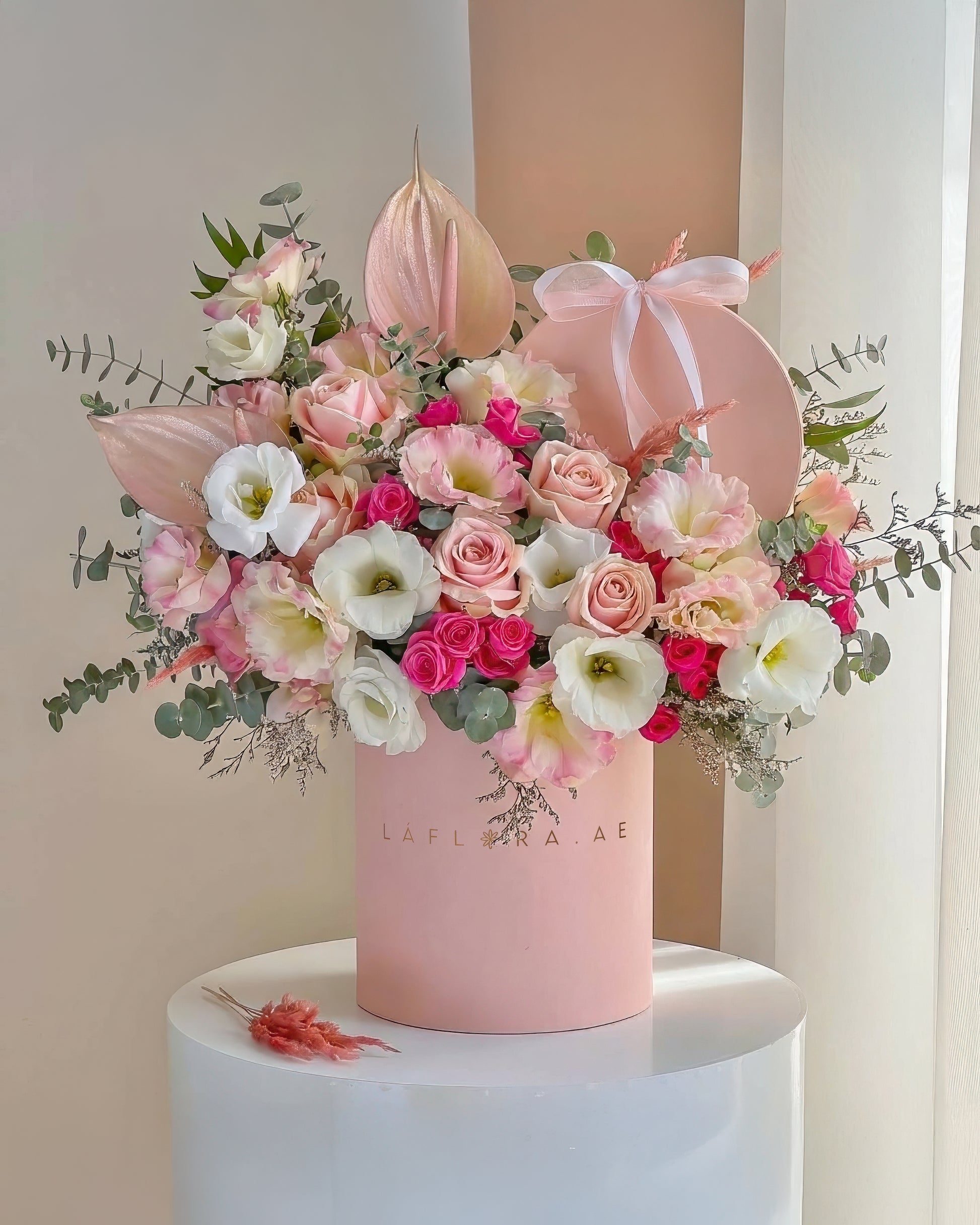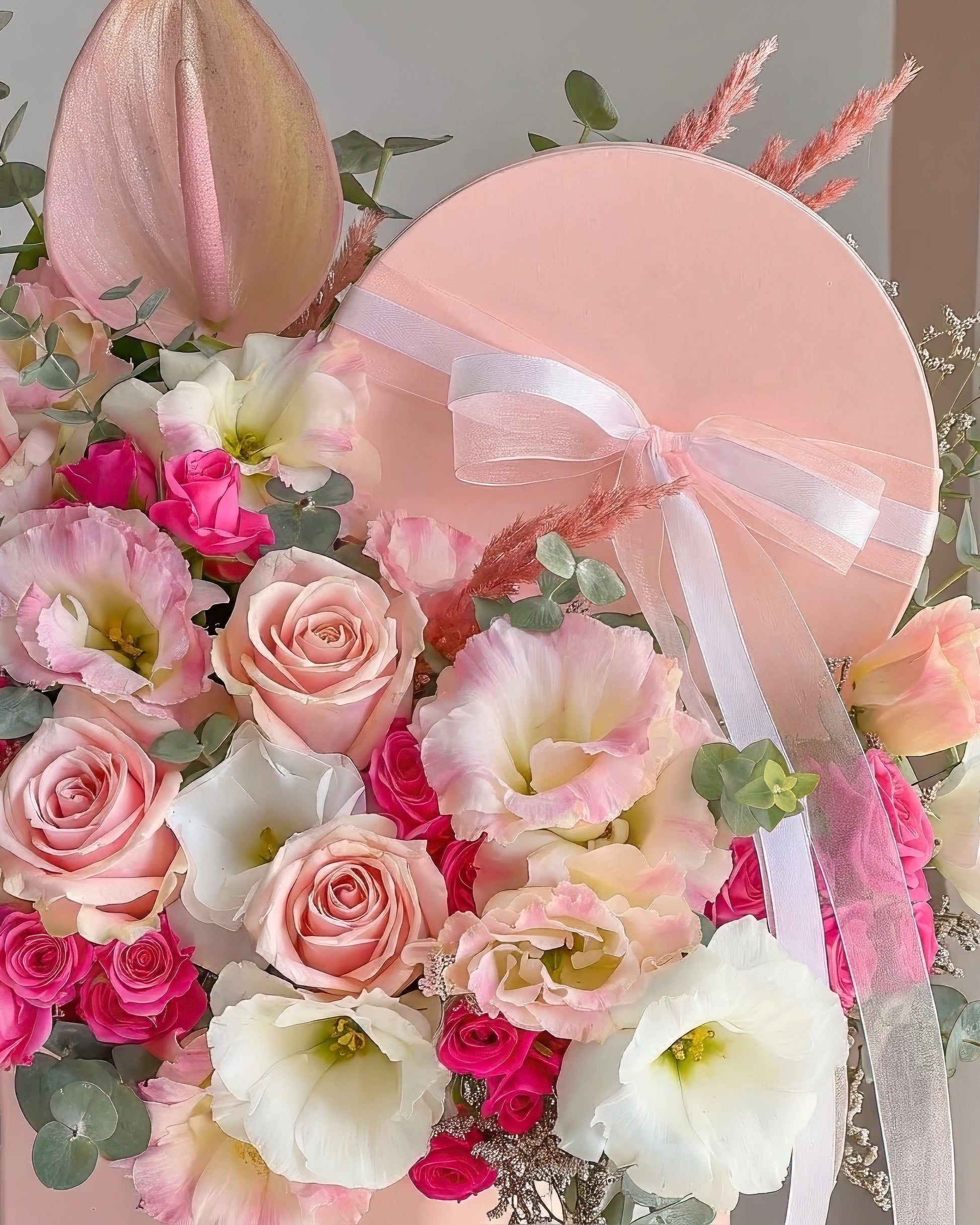 This graceful arrangement exudes timeless elegance with a stunning combination of Blush Pink Anthuriums, Soft Pink Roses, delicate White and Pink Lisianthus, and vibrant Pink Spray Roses. The mix of fresh blooms creates a soft yet striking palette, perfect for any special occasion.