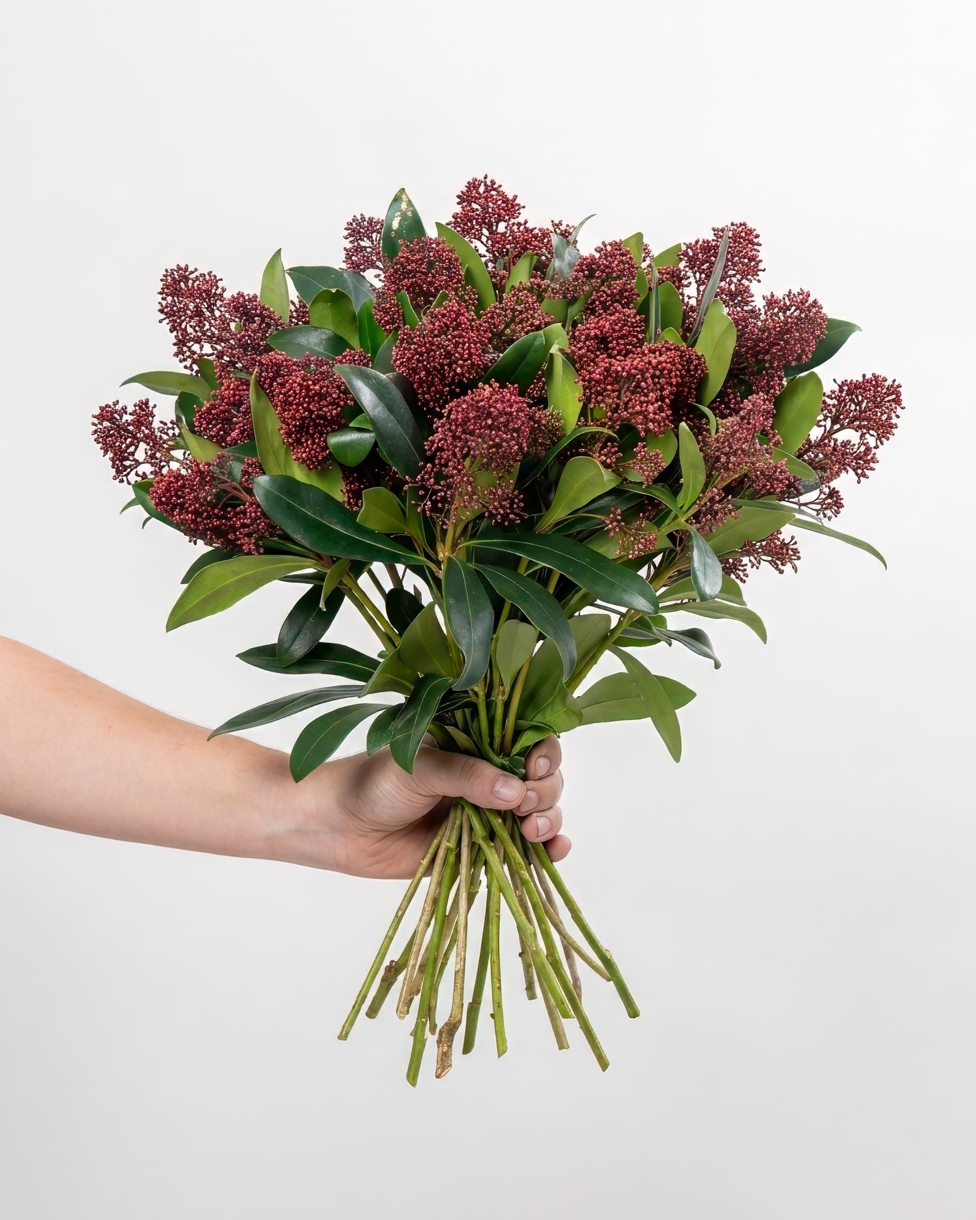 Freshly harvested and carefully packaged, Red Skimmia – Ruby ensures long-lasting freshness and quality, giving your arrangements a vibrant and luxurious finish.