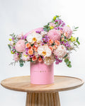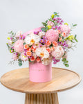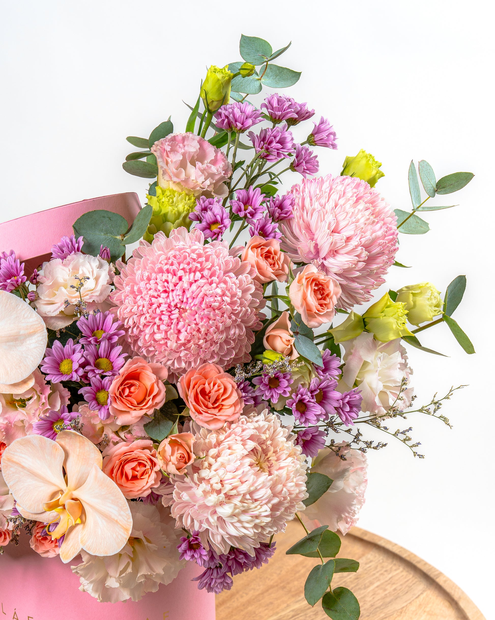 The Roselle Flower Box brings together a refined palette of soft pinks, apricot tones, and fresh greens to create an elegant, modern arrangement. Featuring premium blooms like Peony Pink Chrysanthemum, Sweet Sarah Spray Roses, Santini Rossi, Light Pink Eustoma, and Apricot Phalaenopsis, this design feels luxurious yet naturally romantic. Accents of Limonium and Eucalyptus add texture, freshness, and depth.
