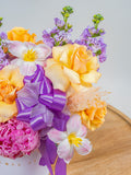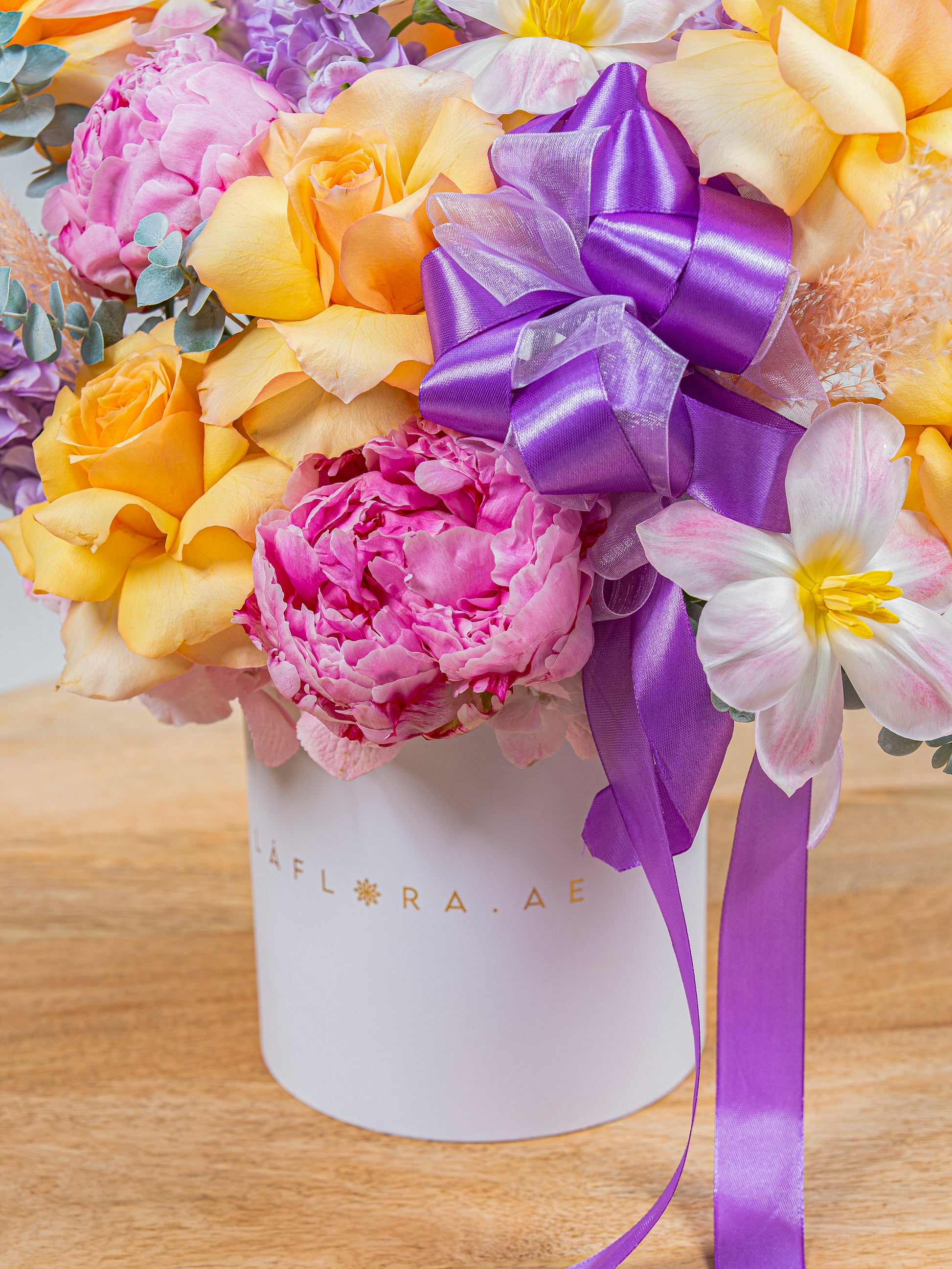The Sarah Flower Box is designed to melt hearts with its tender colors and graceful blooms. Lush Pink Peonies bring a luxurious softness, while Light Pink Tulips add a gentle touch of elegance. Peach Roses offer warmth and affection, balanced beautifully with the sweet fragrance of Purple Mattiola.