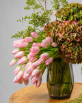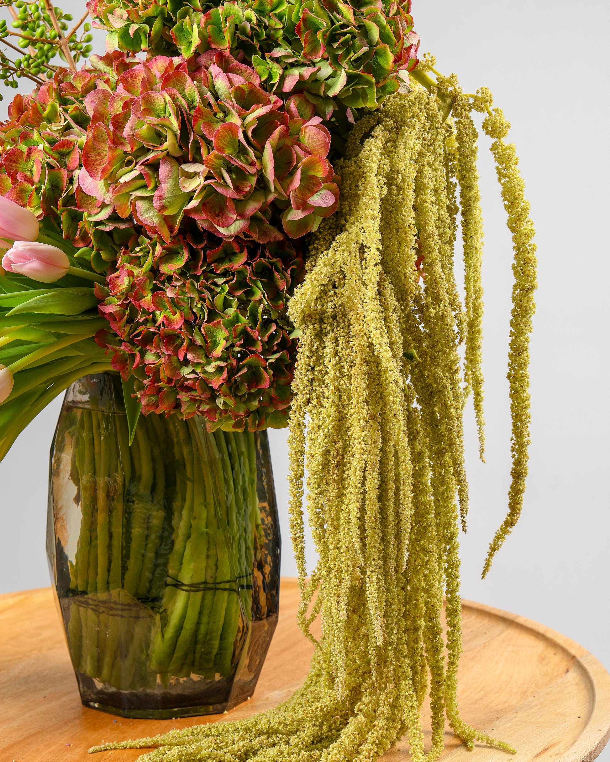 This exquisite luxury vase arrangement features a stunning blend of seasonal blooms. Soft light pink tulips cascade gracefully alongside green-red hydrangeas, accented with trailing green amaranthus and the unique beauty of Rosebottle Corallo. Designed to impress, this artistic composition brings together texture, color, and elegance, making it the perfect choice for birthdays, anniversaries.