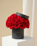 Celebrate love with the Valentine Premium Red Roses Box, designed for maximum impact. This stunning arrangement features a front-facing dome of premium hand-selected red roses, perfectly shaped and rich in velvety color. The back is neatly finished with a structured hatbox cap and fresh greenery.