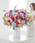 Step into a world of refined beauty with the Veloura Flower Box, a luxurious tall dome-shaped arrangement presented in Laflora’s signature sleek white box (45cm tall and 25cm wide). This design captures the essence of sophistication through its exquisite mix of purple roses, blue hydrangeas, misty bubble spray roses, purple carnations, and dual-shaded pink lisianthus, adorned with lush eucalyptus details.
