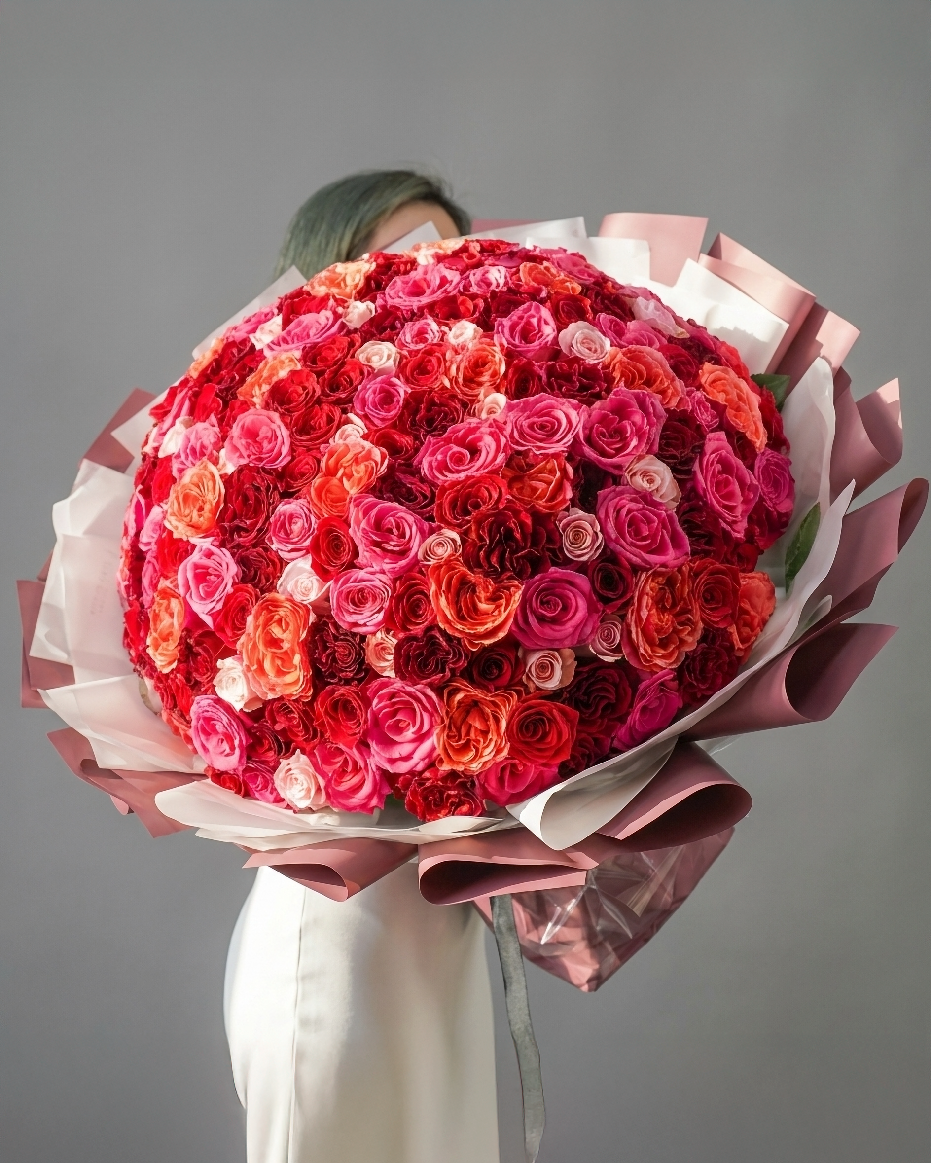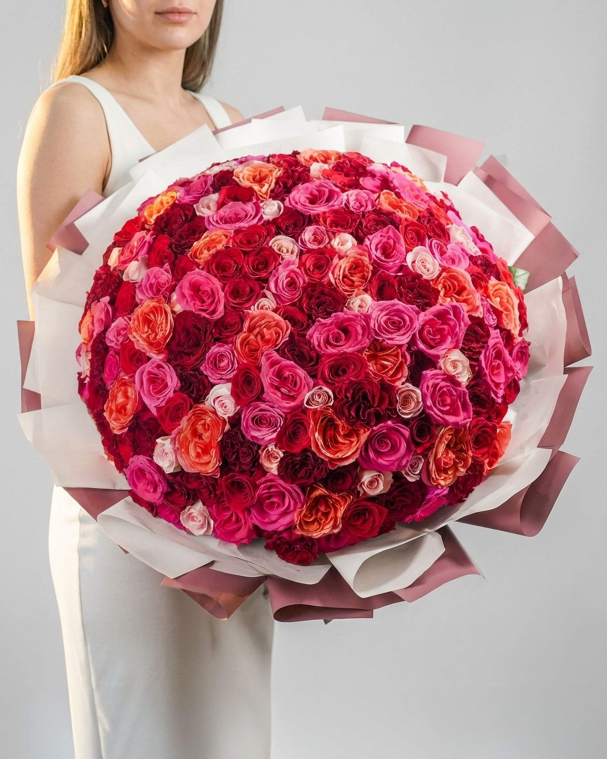 Make a bold and unforgettable statement with the Vivid Romance Bouquet, a luxurious arrangement of garden and premium roses designed in a captivating ombré of fuchsia, red, orange, and light pink. Wrapped in elegant luxury paper, this grand bouquet symbolizes the many stages of love from passion and desire to warmth, admiration, and gentle affection. Ideal for anniversaries, birthdays, proposals, or romantic surprises, it is handcrafted by Laflora, Dubai’s trusted flower shop, and delivered fresh with same-day roses delivery Dubai.